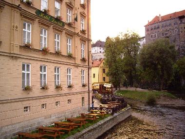 ブルタヴァ川に面して建つ歴史あるホテル。窓からはチェスキー・クルムロフ城が見えます。