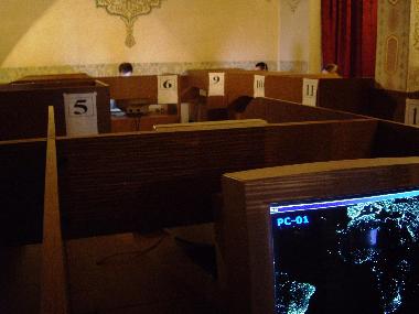 ビルの二階にあるそのネットカフェ、奥にはバーカウンターがあって手前には仕切りのある部屋にコンピュータがずらり。このネットカフェ、手前がトイレ臭くて暗くて、ちょっと来辛い…割に、入口にはシャンデリアがあったりして。壁の模様なども、やっぱりチェコっぽいです。