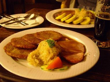食事はハム・ステーキにポテト・パンケーキ、ザワー・クラウト添え。ハムがジューシーで美味しいです。ポテト・パンケーキ、これまた旨いっ!ハッシュドポテトが薄くもっと細やかになった感じで、まぶしてあるハーブが絶妙。スナックみたいで500mlの大きいビールも進みます。