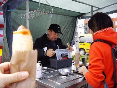 プラハでも見かけましたが、私はチェスケー・ヴティヨヴィッツェの駅近くのショッピングセンター(バスターミナルのあるところではありません)前の屋台で買って食べました。