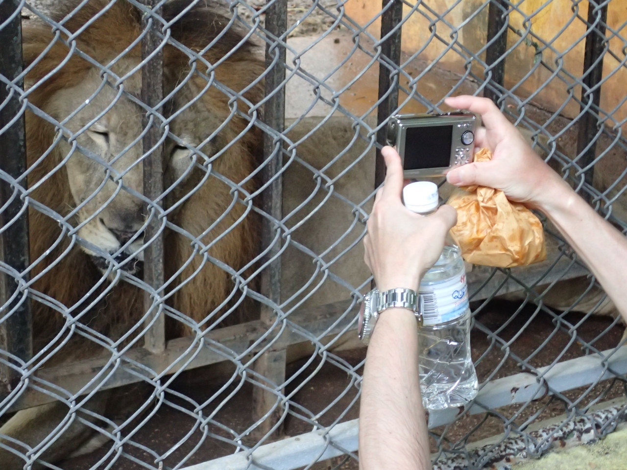 観光客と動物の距離はかなり近いです。ライオンを金網越しに至近距離で見ることができました。大トカゲに至っては金網に体を寄せて目の前で寝ています。他にトラ、ヒョウ、珍しいサルもいますが、種類は多くなく、こじんまりとした素朴な動物園です。