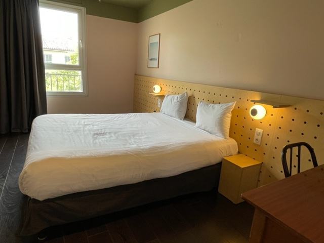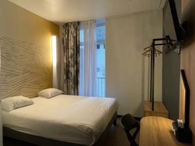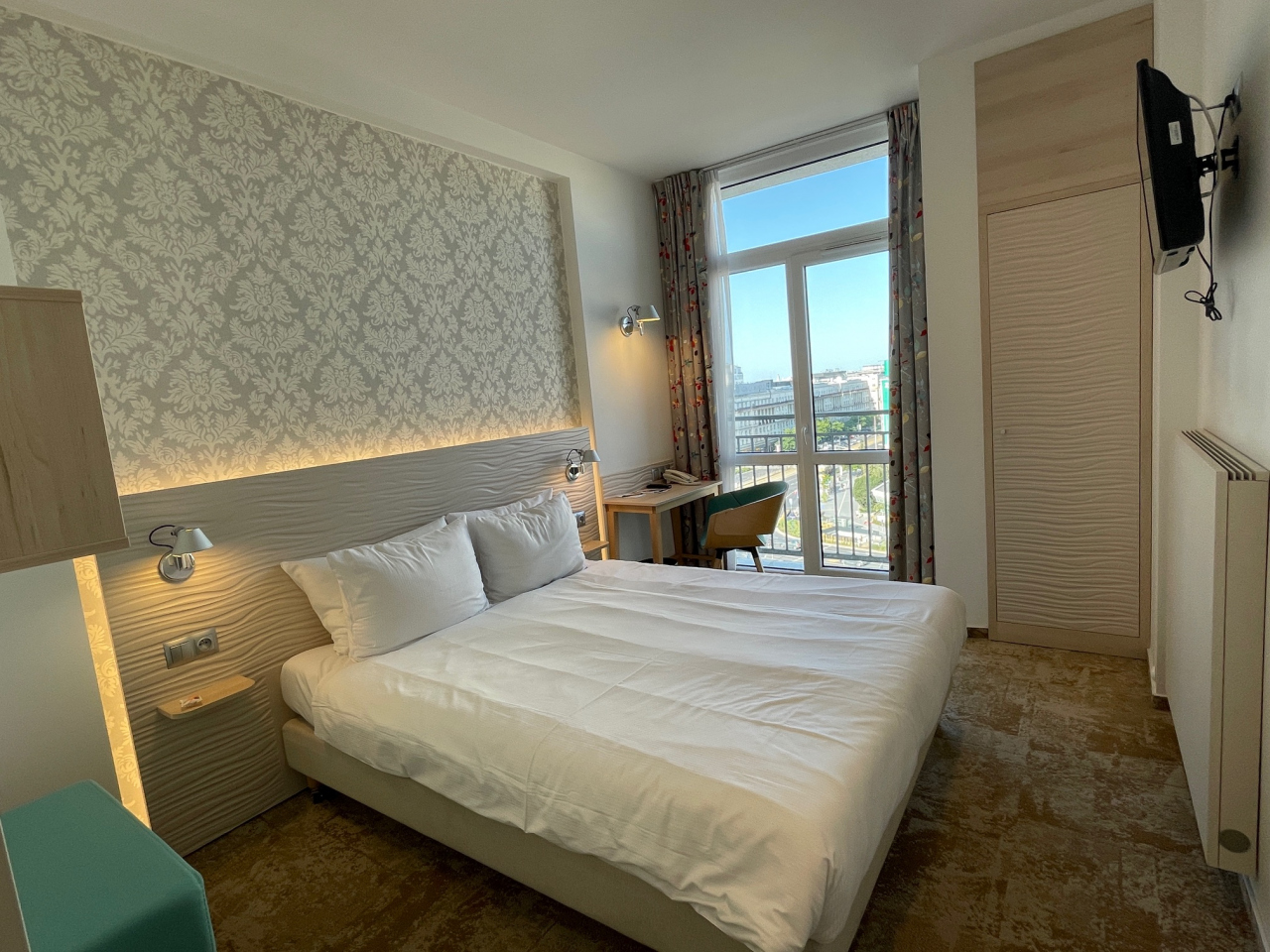 駅から徒歩で中心地へ向かい10分弱、ギャラリーラファイエットの斜め前にホテルがあります。お部屋は通路にスーツケースを開けれる程度、それまで宿泊したホテルに比べて狭かったですがテラスが付いていたので開放感がありました。シャワーの使い勝手なども問題なく、滞在中特に不都合なかったです。スタッフは皆さん親切で24時間対応しています。