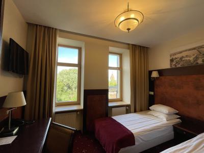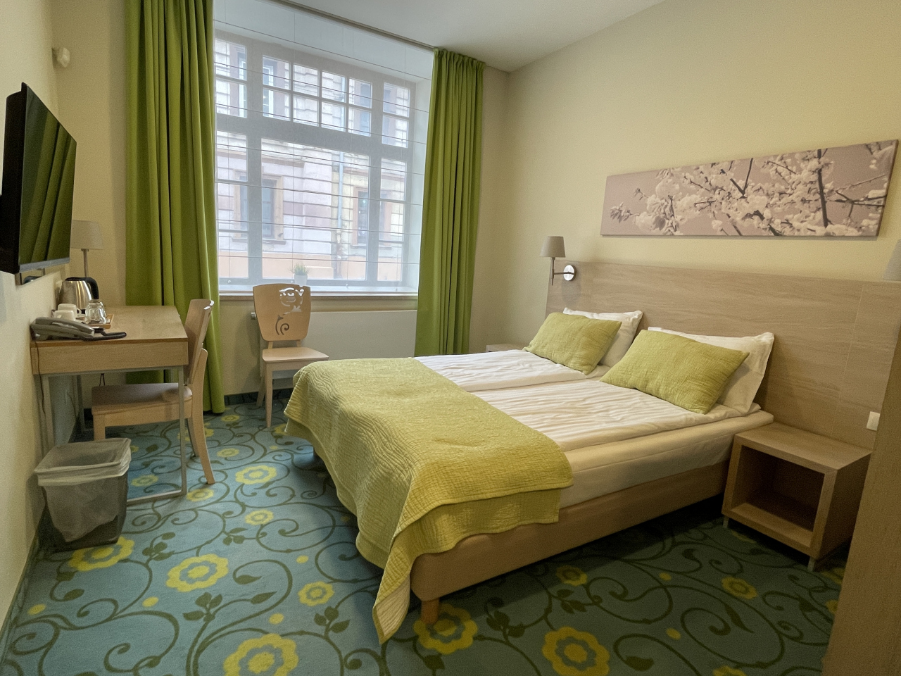 バスターミナルから近く、地下道を通らずに行くことができます。11時半ごろに到着しましたが、チェックインできて良かったです。フロントロビーはクラシックなヨーロビアンスタイルで落ち着いた雰囲気、ツインルームのお部屋には冷蔵庫やポットも備わっており、窓からは科学アカデミーがチラッと見えました。旧市街の中心地へもすぐ行けるので、観光途中に休憩で戻ったりと便利でした。
