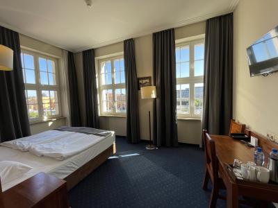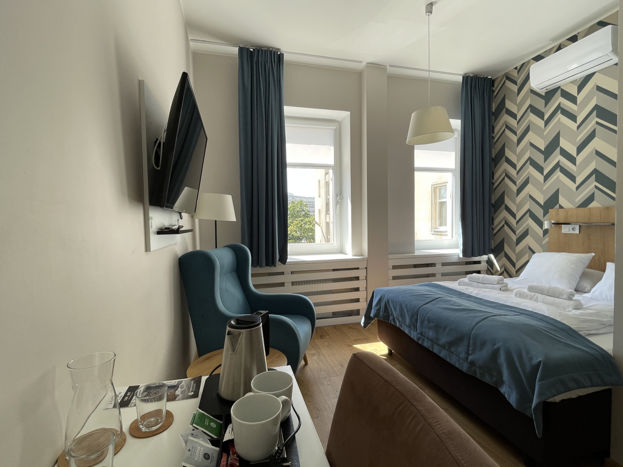 旧市街から歩いて5分程の場所にあります。空港からホテル、ホテルからバスターミナルへの移動がありましたが、トラムやバス停も近く便利でした。スタンダードのお部屋でしたが広さも十分で、冷蔵庫やポットもあり、ボディローションなどのアメニティも揃っていました。また、チェックイン時に申告するとペットボトルの水を2本もらうことができます。表通りから奥まったところにあるため静かで快適、スタッフの対応も良かったです。