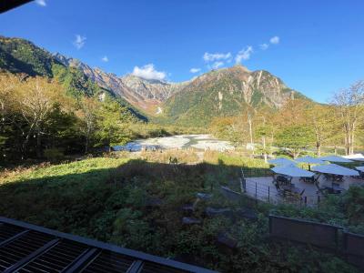 バスターミナルから徒歩10分弱、河童橋を渡ってすぐのところにあるホテルです。穂高連峰が見えるリニューアルツインルームに宿泊しました。元々は焼岳側で予約していましたが、前夜に空室があるのを見て急遽変更しました。(事前に問い合わせると、穂高眺望や穂高独占というお部屋しか良い眺望はないようで、部屋の指定や希望もできないと回答がありました)