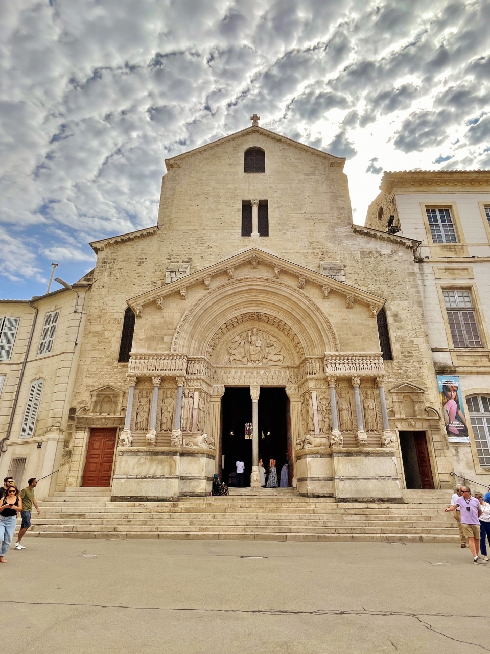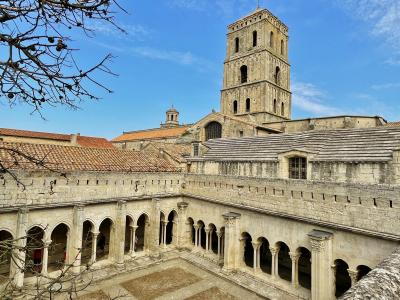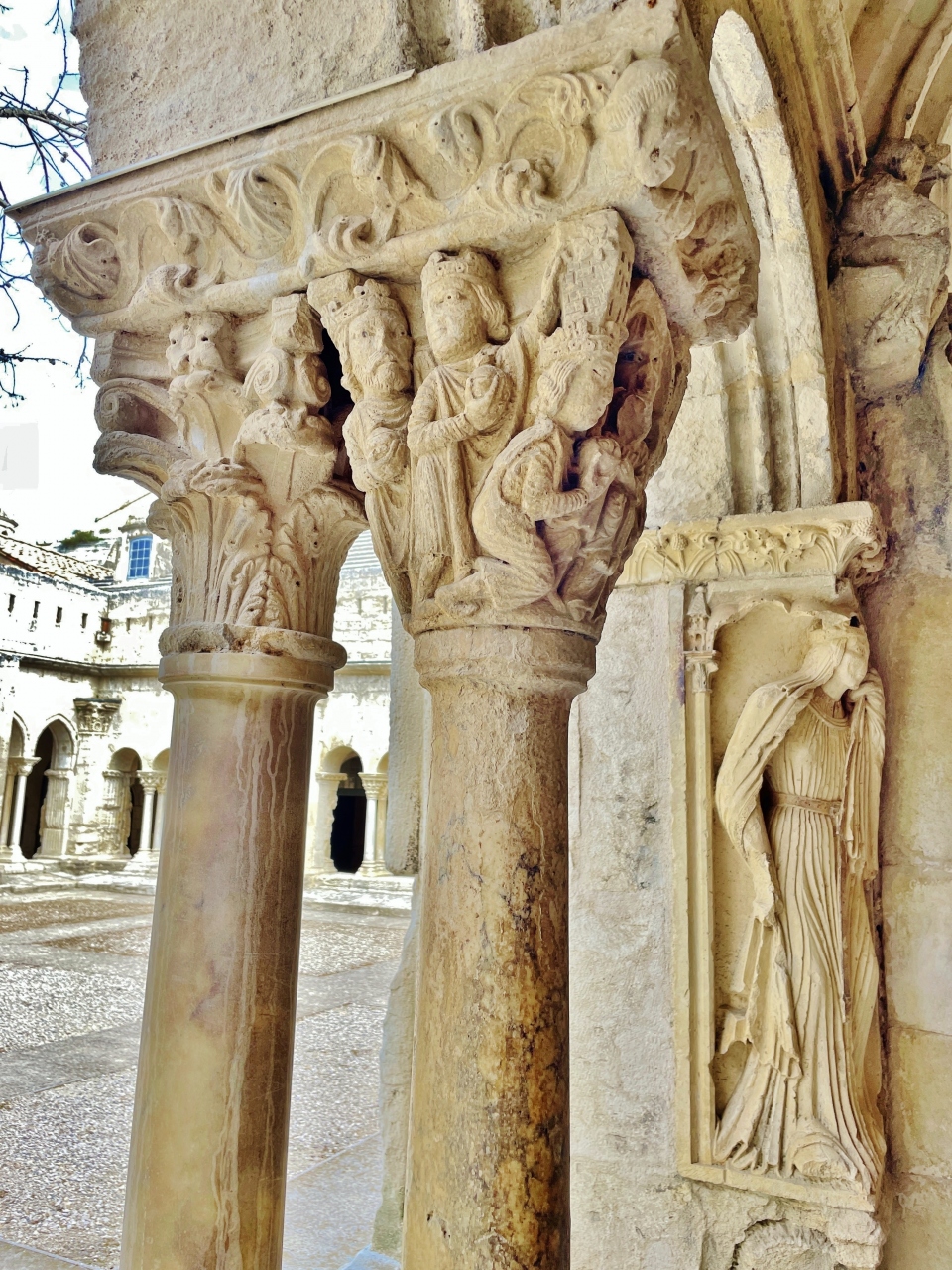 聖トロフィームの聖遺物を祀るため、11~12世紀頃にロマネスク様式の教会として建設されました。門の上部には、最後の審判をモチーフにした彫刻装飾が施されています。教会内部はゴシック様式に改装され、外観に比べてシンプルな印象でした。回廊へは一旦教会から出て向かいました。こちらは有料となっています。柱1本ずつに細かい彫刻が施され、2階のテラスからは回廊全体が見渡せました。