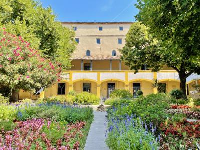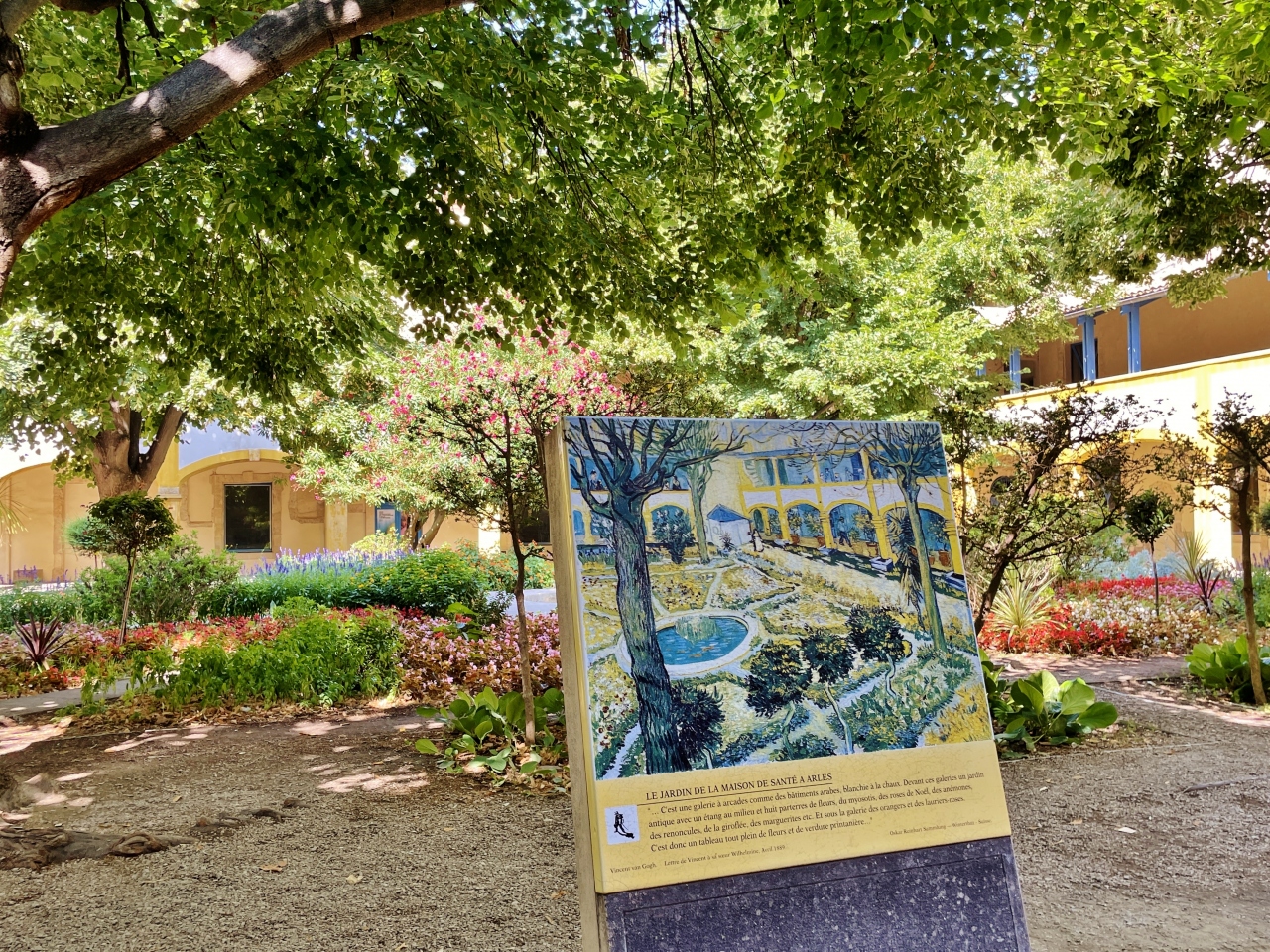かつてゴッホが入院したアルル市立病院でしたが、現在は図書館や展示室、お土産店やカフェなど併設した施設になっています。中庭が「アルルの療養所の庭」のモチーフとなった場所で、ゴッホの絵を元に忠実に再現されています。庭の中央には小さな噴水が設置され、花壇が八方に広がり美しい空間でした。「アルルの療養所の庭」を紹介する案内板も立っています。