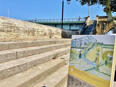 旧市街の北側、コンスタンティヌスの公衆浴場跡からほど近い場所にあります。ゴッホがアルル滞在中に描いた橋です。橋の前には絵のパネルが置かれていました。橋は戦争などで破壊と再建を繰り返しましたが、川沿の階段や石造アーチは今も絵のままの風景が残っています。