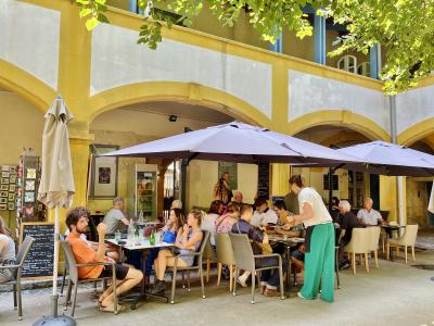 かつてゴッホが入院したアルル市立病院、エスパス・ヴァン・ゴッホの中にあります。現在は図書館や展示室、お土産店やカフェなど併設した施設になっています。中庭を見学後、ちょうどお昼時だったのでテラスがあることらのお店でランチ兼休憩しました。ランチメニューはまだ早く、ガレットとクレープのセットを注文、2つ食べるとお腹一杯になりました。席からも中庭が見渡せて良い眺めでした。