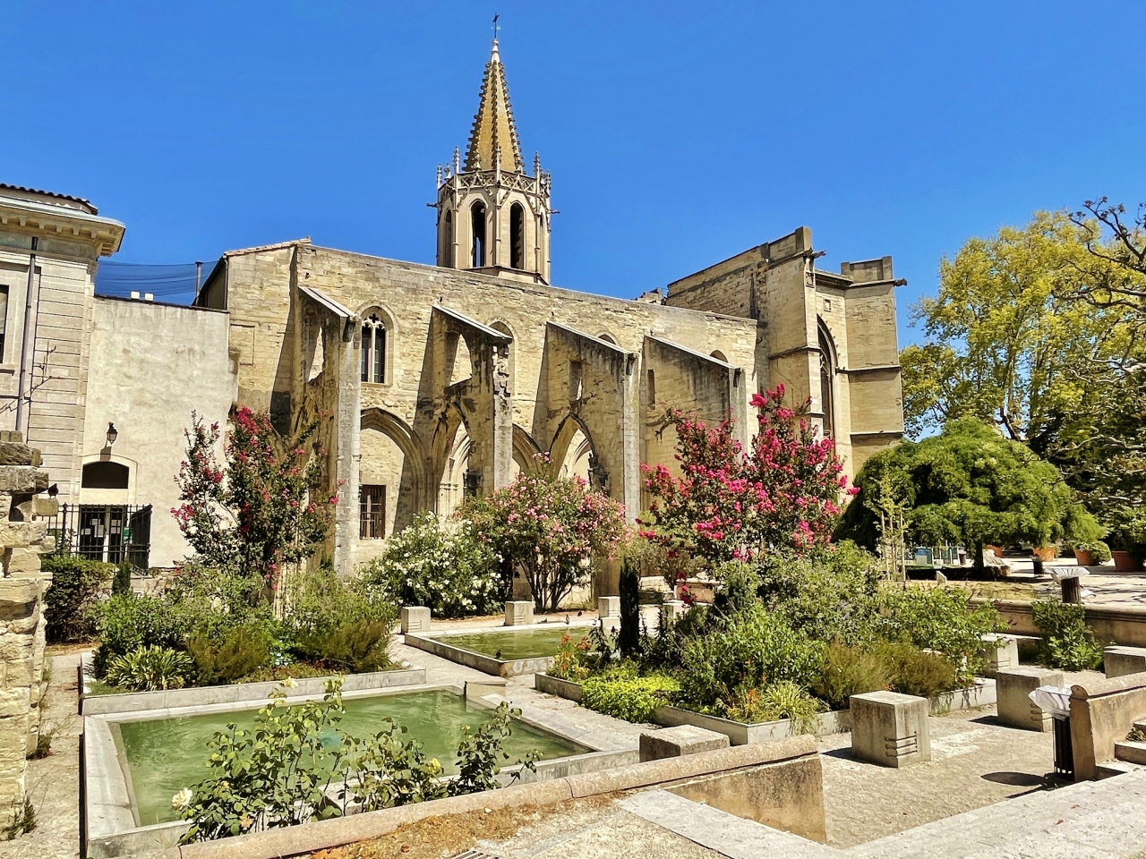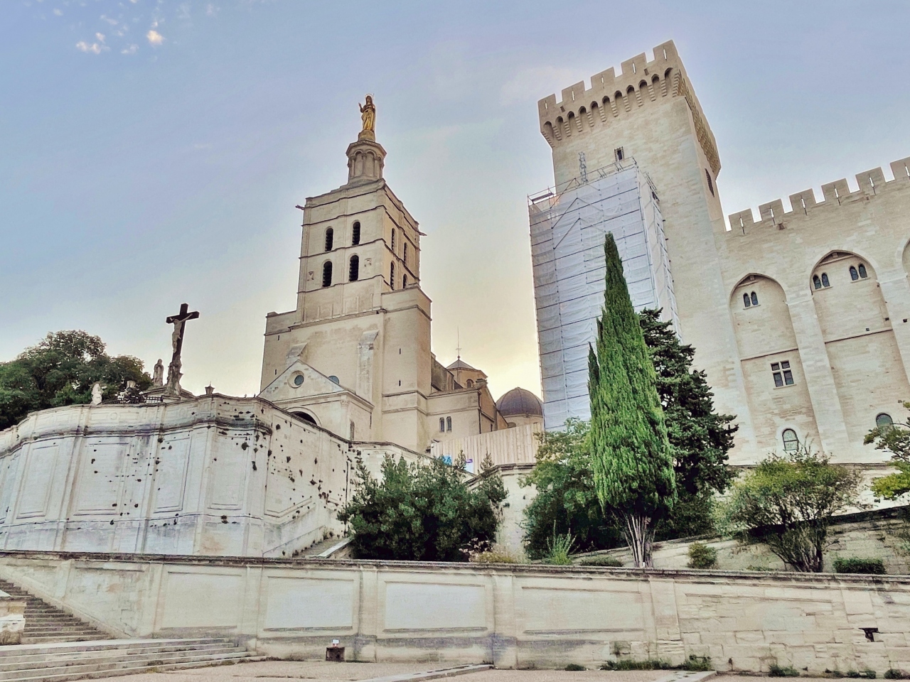 法王庁宮殿に隣接して建っていて方角によっては一体化して見えます。鐘楼上にある黄金のマリア像が印象的な外観です。12世紀半ばロマネスク様式で建設され、その後幾度かの増改築を経て現在に至ります。内部は外観同様にシンプルで、白を基調とした美しい造りでです。坂を上ったところに入口があり、広場全体が見渡せて良い景観でした。