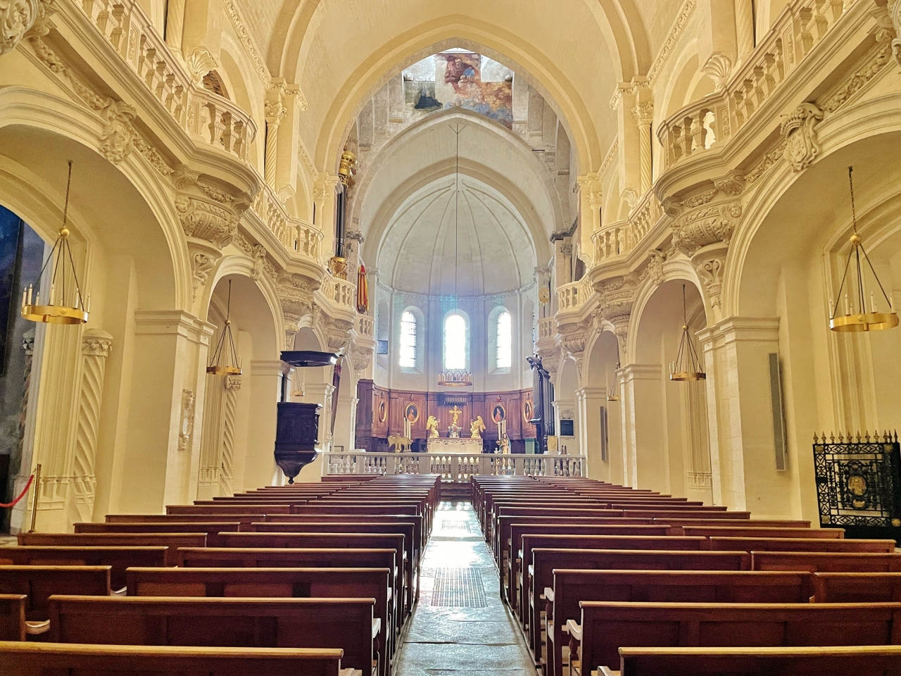 14 世紀半ばに建てられたゴシック様式の教会です。教会名と同じサン・ディディエ広場に面して入口があります。中に入ると天井が高く広々としています。主祭壇のステンドグラスが美しく、後方には大きなパイプオルガンが置かれていました。シンプルな造りですが、絵画や彫刻で飾られていて荘厳な雰囲気でした。