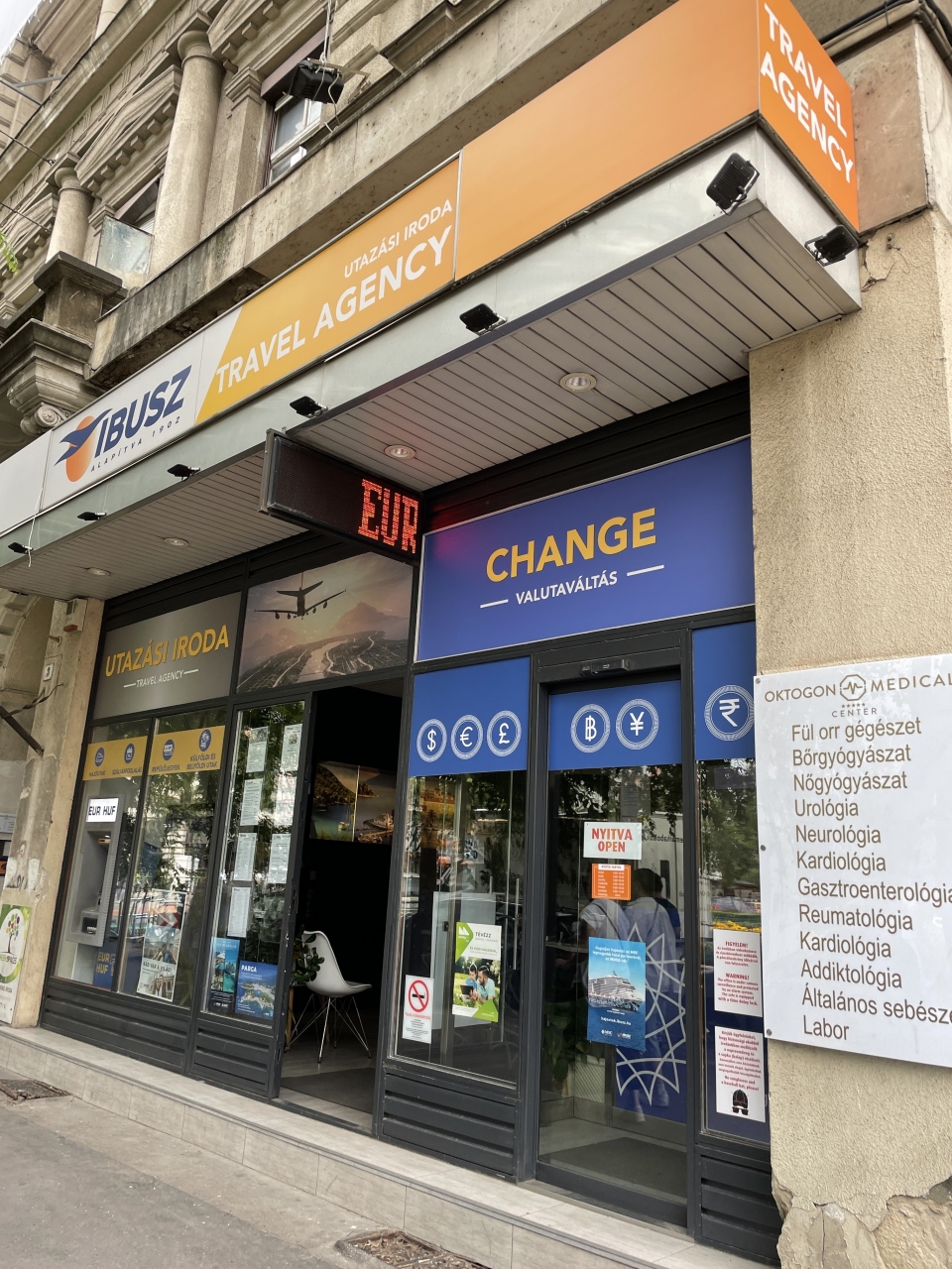 オクトゴン駅のロータリー交差点沿いにあります。ハンガリーでは良く知られる旅行代理店です。長距離バスやイベントのチケット、ホテルの予約など一般的な手配を行っています。こちらの店舗では両替所が併設されていたので、急にフォリントが必要になった場合にも利用できます。