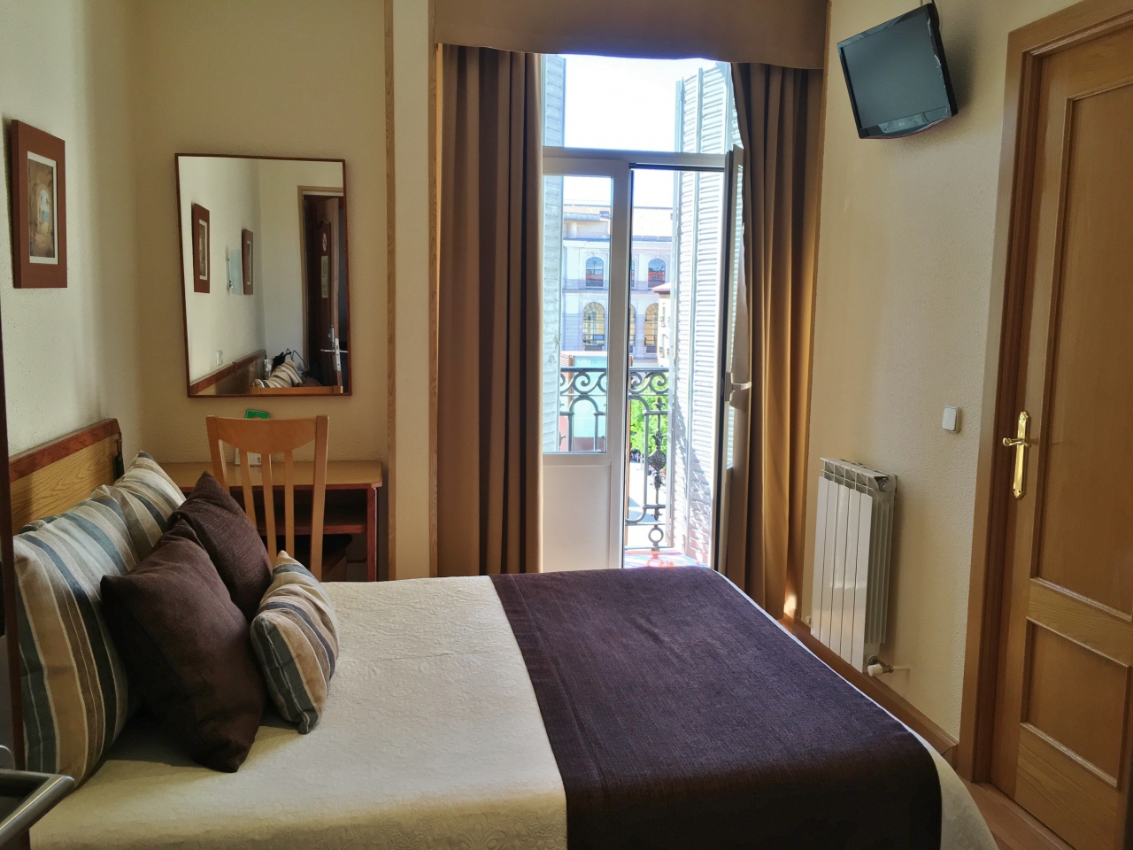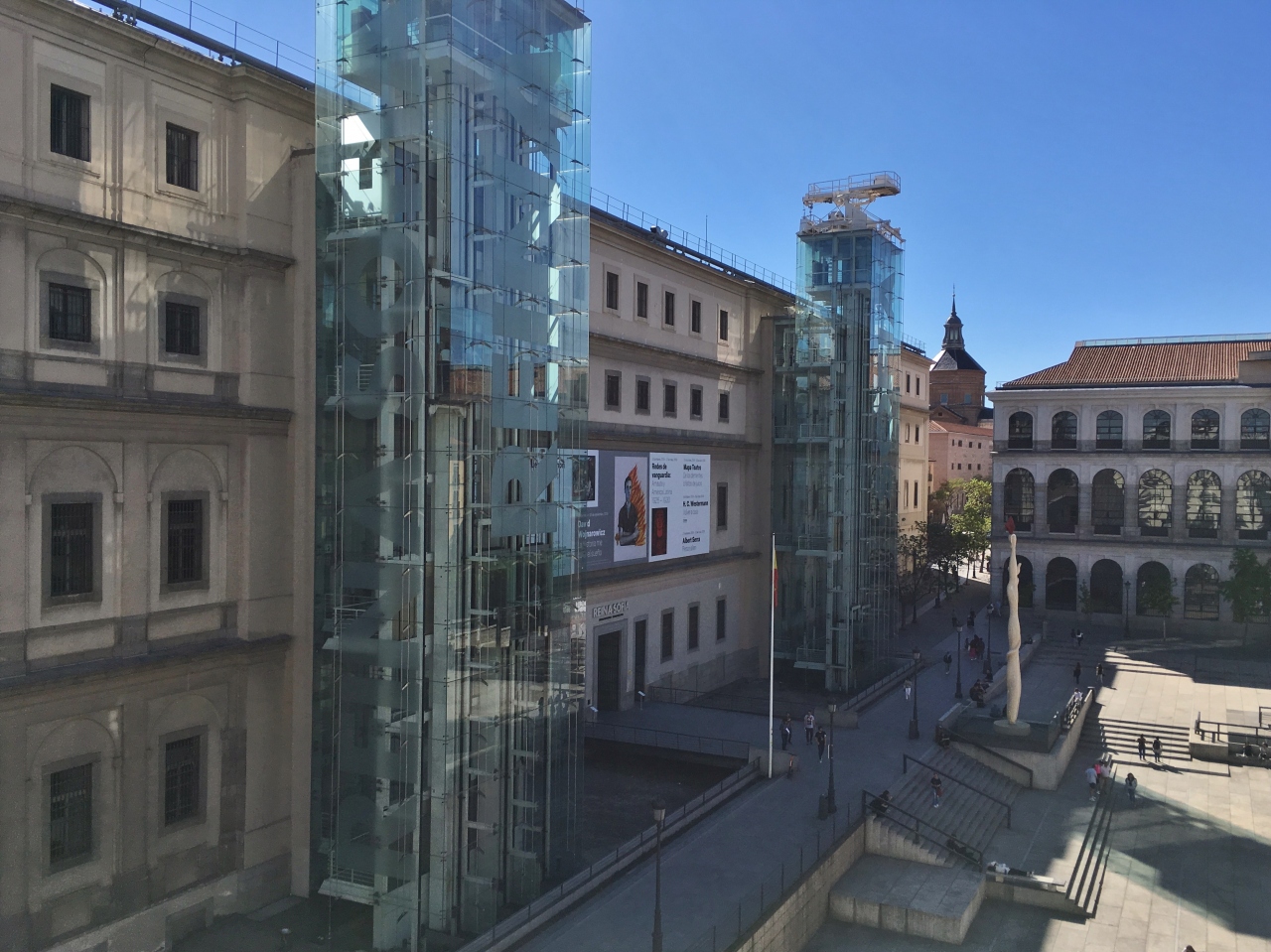 部屋の広さもまずまずでバスタブ付、ポットはなかったですが冷蔵庫はあります。眺望の良い部屋をリクエストしたからか、窓を開けるとソフィア王妃芸術センターの広場が見えました。