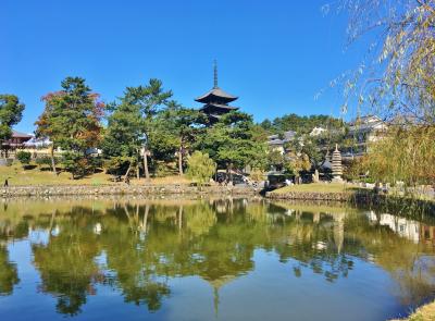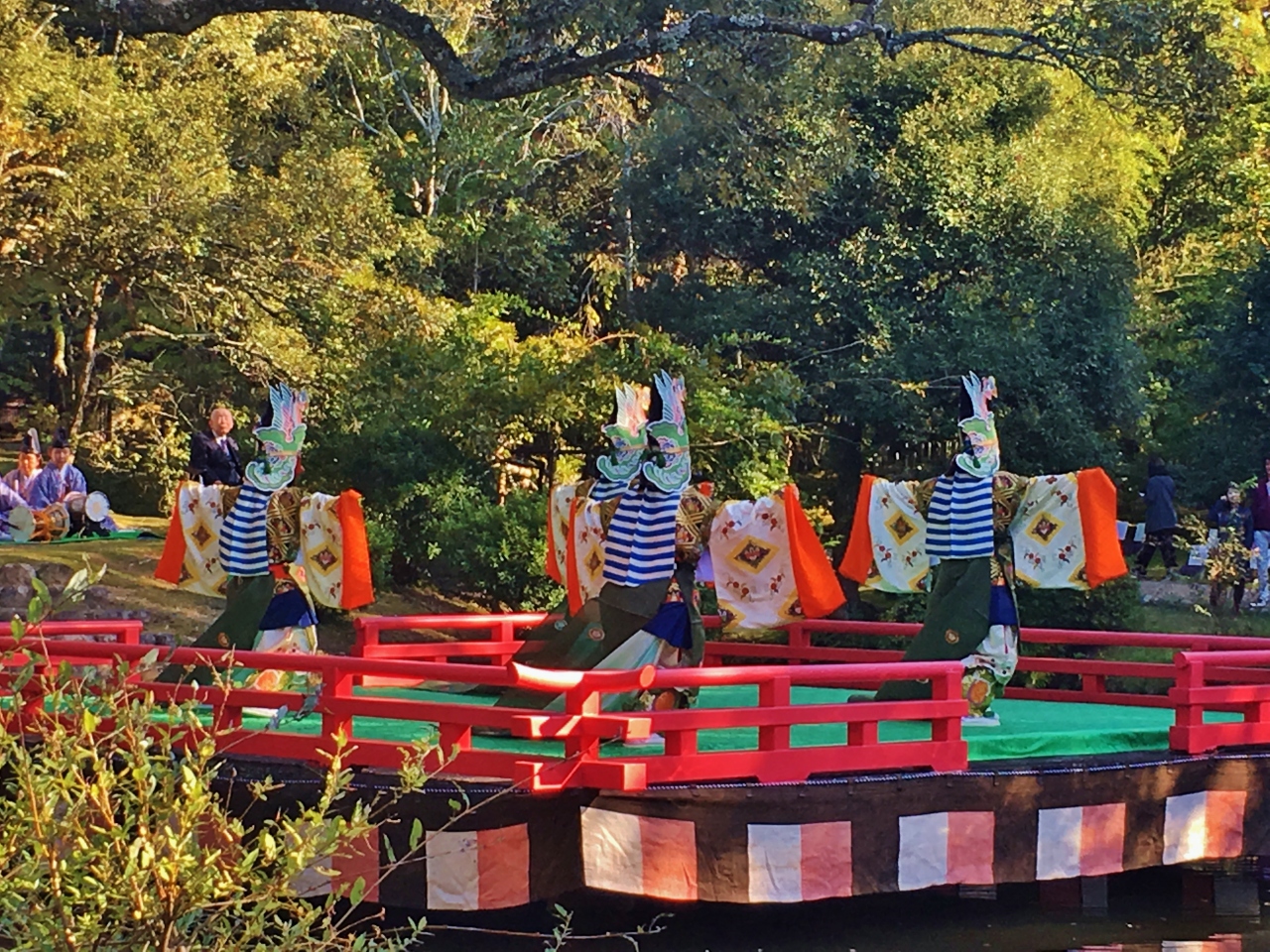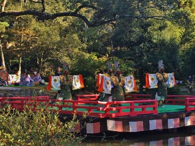 園内で行われる管絃と舞楽の演奏会「萬葉雅楽会」を鑑賞するため入園しました。池の中之島に張り出した舞台での雅で華麗な舞に見入ってしまいました。植物園を一周すると、11月初めでしたが所々紅葉している木もありました。藤が有名とのことで春に訪れたいです。
