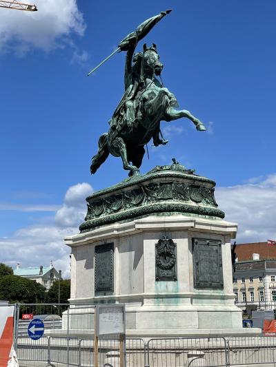 美術史博物館からブルク門を入り、ヘルデンプラッツ(英雄広場)にある騎馬像です。新王宮側にあるオイゲン公の騎馬像と向かい合って建っています。ナポレオンとも戦ったオーストリアを代表する軍人で、力強く躍動感あふれる騎馬像が印象的です。