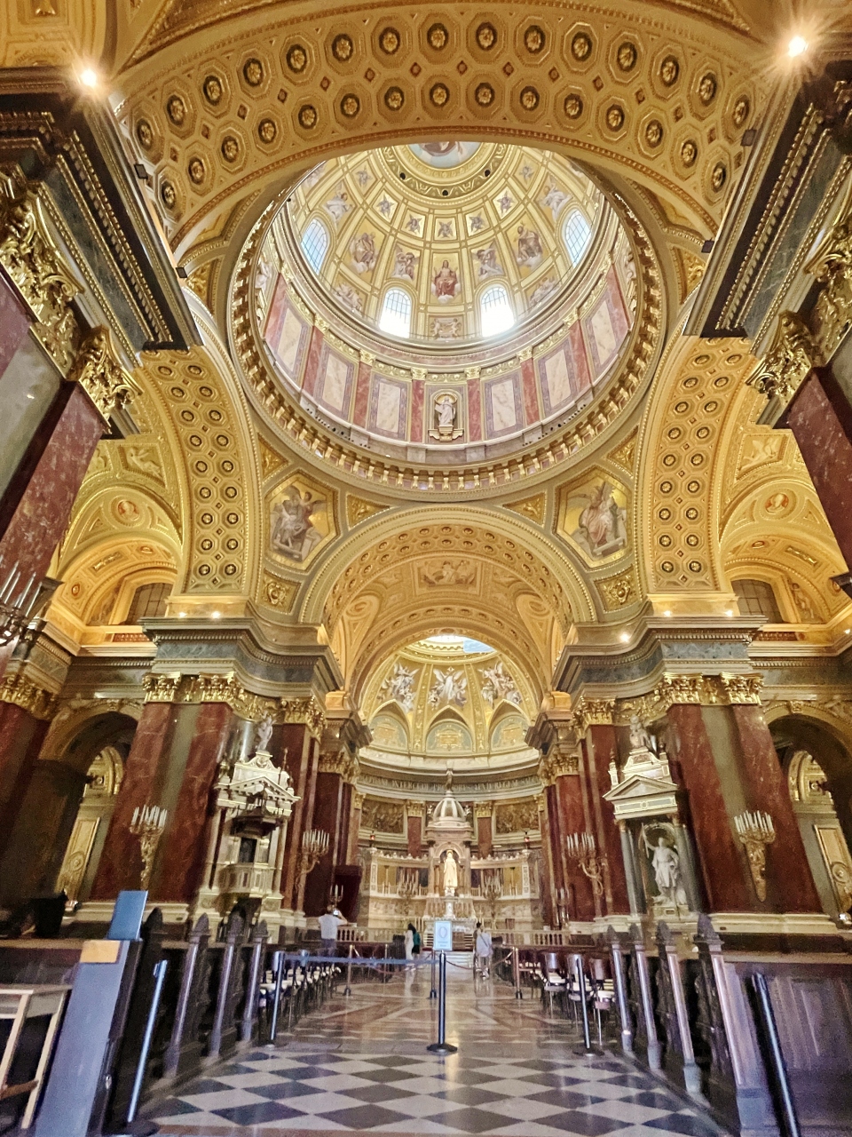 ハンガリー王国建国1000年を記念して1851年に建設が開始され、途中ドームが崩壊などのアクシデントを経て1905年に完成しました。大聖堂の内部は以前は無料だったようですが、今は有料でドームや宝物館へ行くかにより料金が異なります。内部の主祭壇には聖イシュトヴァーン像があり、聖イシュトヴァーンの右手ミイラが展示されている「聖なる右手礼拝堂」が見所の一つになっています。展望台へは階段又はエレベーターで上がることができます。ブダペストの街並みが眼下に広がり、地上から眺めるのとはまた違った印象を受けました。