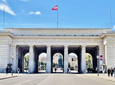 美術史博物館や自然史博物館があるマリアテレジア広場から新王宮へ行く際に通る門です。幅広い大きな門で、複数のアーチがあるのが特徴的です。車が通るので近くでゆっくり門を眺めることができないのが残念です。門をくぐると王宮エリアでオイゲン公騎馬像やカール大公騎馬像があります。