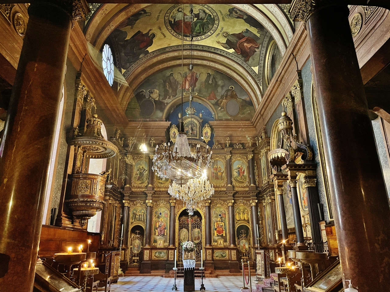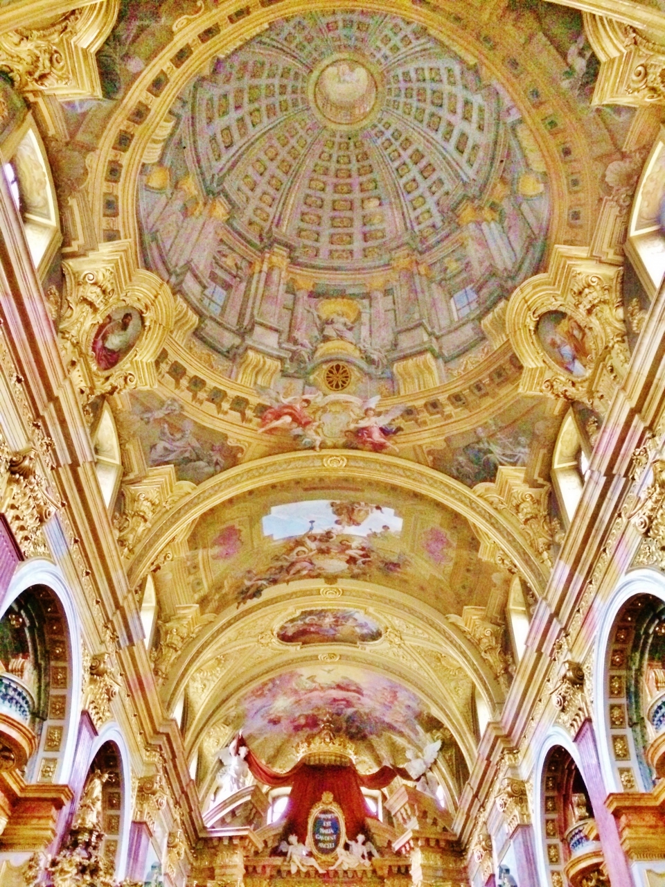 1631年完成したバロック様式の教会です。その後改修が行われ、現存するのは19世紀のものだそうです。外観はいたってシンプルですが、一歩中へ入ると豪華絢爛な金装飾に目を奪われます。一番の見どころはドーム型天井で、実際は平面に絵でドームを描いているだまし絵です。