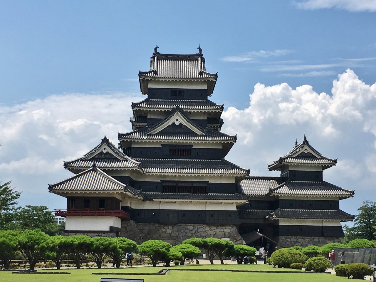中央は大天守、右手に乾小天守、左手に月見櫓があります。この他、渡櫓と辰巳附櫓の5棟から形成され、1936年国宝に指定されました。混雑が心配でしたが、並ぶことなく天守閣へ入城することができました。鯱瓦や鉄砲など展示物を見学しながら天守最上階へ。上階への階段はかなり急勾配で、警備員さんが各階段で誘導していました。東西南北の各窓から景色を眺めることができますが、窓が狭く夏だったので蒸し暑かったです。天守閣の見学を終えて公園を散策しました。松堀に囲まれた松本城はどの角度から見ても美しく、水面に映るお城の姿もまた綺麗でした。桜で有名とのことですが、時期的に蓮や睡蓮が咲いていて、四季折々のお花を楽しむことができます。