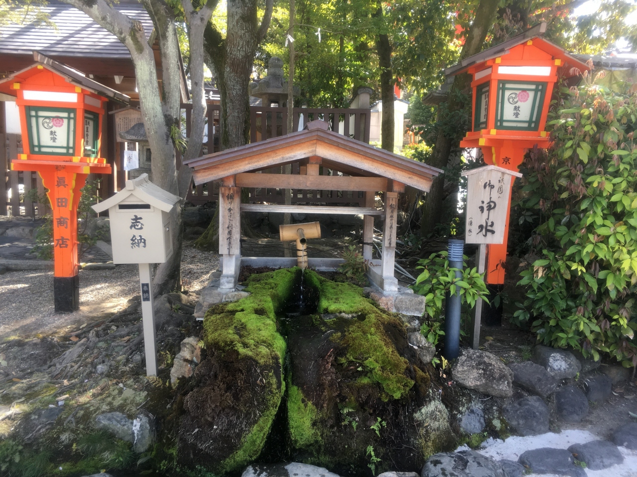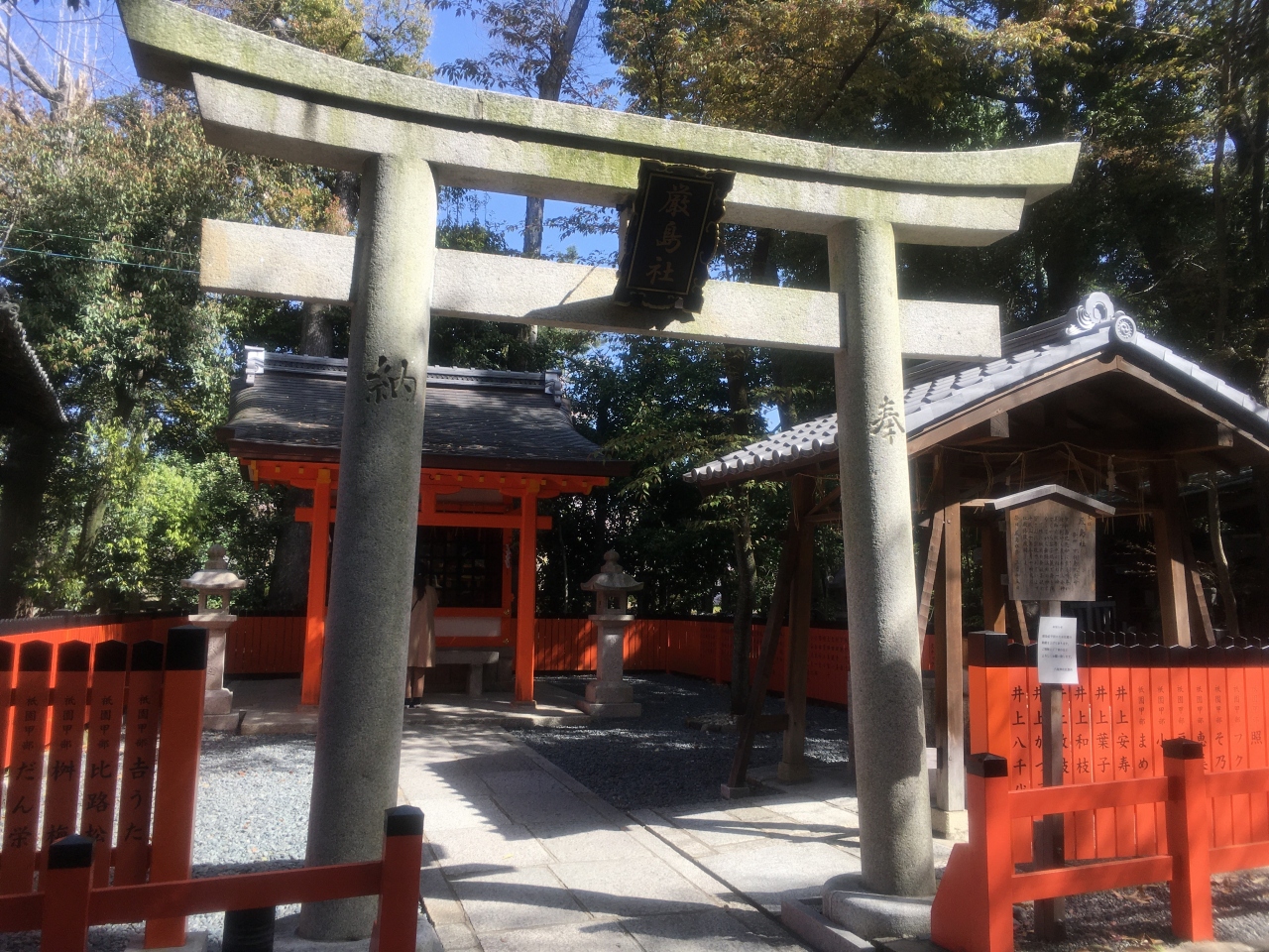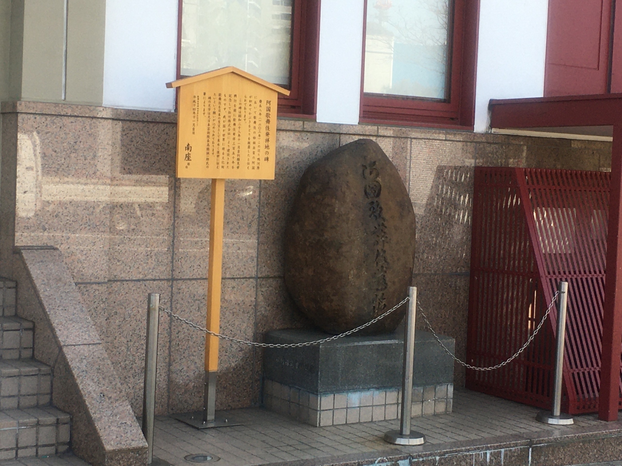 南座の西側、川端通沿いにある茶色の丸い石碑です。祇園商店街や八坂神社への道から外れるため、人通りも少なくひっそりとしています。出雲の阿国の「かぶき踊り」が現在の歌舞伎の発祥とされ、1603年に四条河原で演じたとされています。近くの鴨川沿いには阿国像も建てられているので、一緒に見学できます。