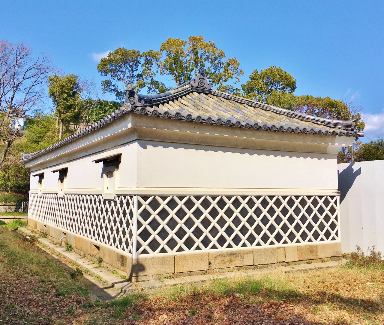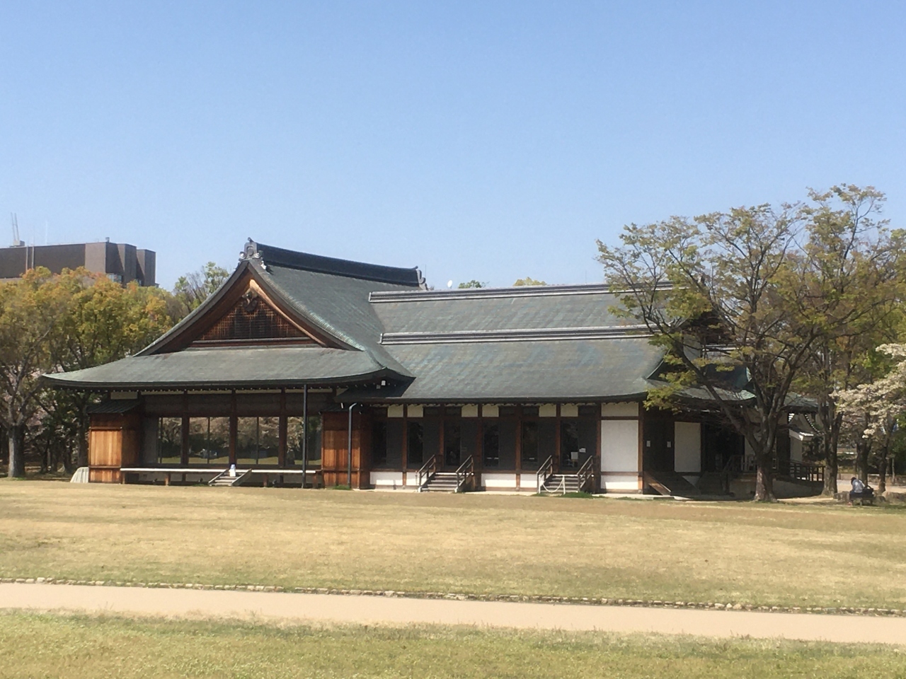 桜の名所としても知られる広い芝生の庭園内にあります。豊臣秀吉の正室・北政所の屋敷があったとされている西の丸庭園は、1965年に開園しました。和風建築の迎賓館は、外観も落ち着いた雰囲気で、周囲の景観とも調和しています。結婚式やレストランとしても利用されていて、ちょうど庭園を訪れた時、結婚式用の写真撮影をされていました。