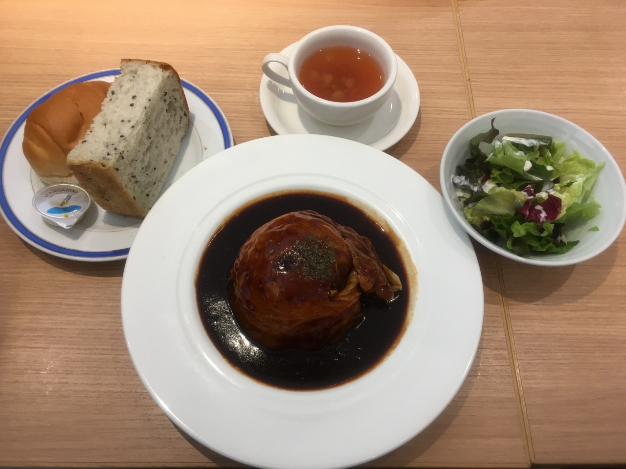 千里中央駅前の阪急百貨店5階にあります。他の階にあるカフェでランチをする予定でしたが満席だったので利用しました。週末のお昼時だったのでお客さんも多くいましたが、店内は広く、テラスの様な席に案内されました。洋食屋さんのようなメニューで限られていましたが、ロールキャベツセット(パン又はライス、サラダ、スープ付)を注文しました。キャベツの量がかなり多いですが、とろけるように柔らかくお肉もジューシーでした。個人的にはデミグラスソースの量がもう少し控えめな方が良かったと思います。味は期待していませんでしたが、思った以上に美味しくて満足です。