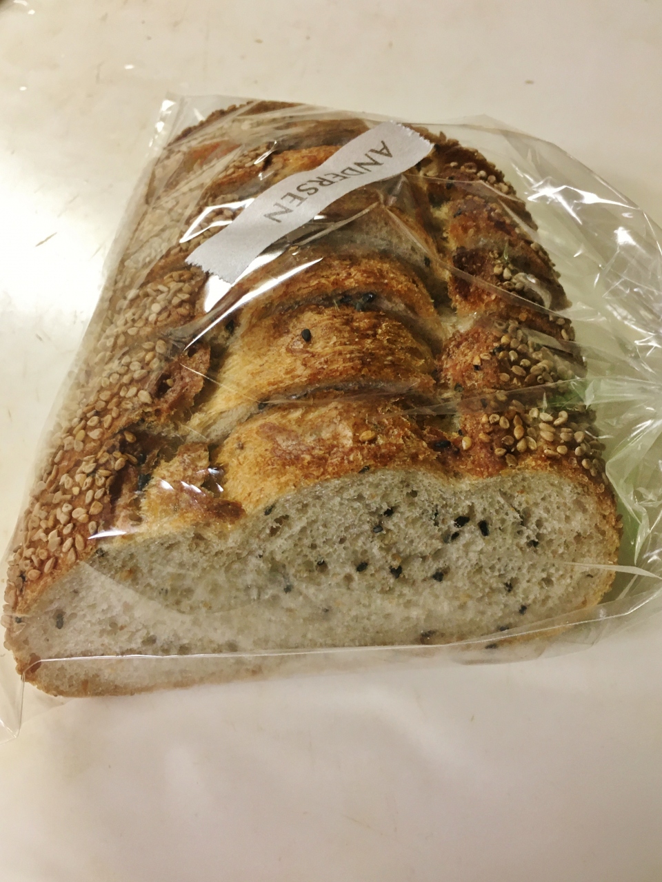 全国に店舗があり良く知られているパン屋さんで、阪急梅田店のデパ地下に入っています。阪急では他にもパン屋さんがいくつかあって、そちらを利用することが多いですが、ちょうどお店前を通ったので明日の朝食用のパンをと入店しました。夕方遅くでパンの種類も少なくなっていました。購入したのは胡麻のパン、全粒粉やライ麦が入っていて、トースターで温めると胡麻の香ばしくて美味しかったです。