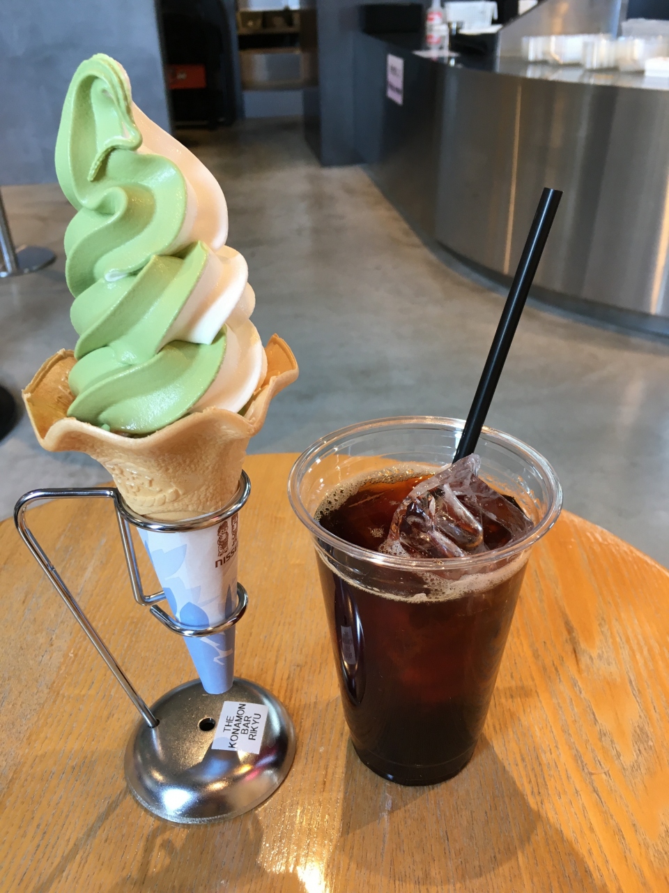 お土産ショップやカフェ・レストランなどが入る複合施設「ミライザ大阪城」内の1階にあります。元々は1931年に陸軍第四師団司令部として建設されたとのことで重厚感がある外観です。大阪城観光後に立ち寄りました。内部は中央に立食形式のスタンド式テーブル、壁沿いに座っていただけるよう低いテーブルが配置されていて、座れる席が少なかったです。大阪城観光後に立ち寄りました。週末だったので混雑していましたが、タイミングよく席が空いたので休憩しました。入口で注文し、呼び出しベルを貰って出来上がりを受け取るシステムです。暖かい日だったのでアイスコーヒーとソフトクリームを注文しました。たこ焼きはテイクアウトできるようにプラスチックケースも置かれていて、美味しそうでした。気軽に利用できてちょっとした休憩には良かったです。