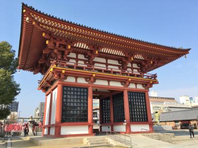 四天王寺の西側入口には石鳥居があります。直進すると西大門、さらに進むと金堂や五重塔がある中心伽藍へと続きます。石鳥居の上部にある扁額は1326年の鋳造で、「釈迦如来転法輪処当極楽土東門中心」と記されています。釈迦如来が法を説く場所で、極楽の入口であると意味があるそうです。かつての四天王寺は海を臨める場所で、石鳥居の西方は極楽浄土に通じるところとして海に沈む夕陽を拝み仰されていたようです。