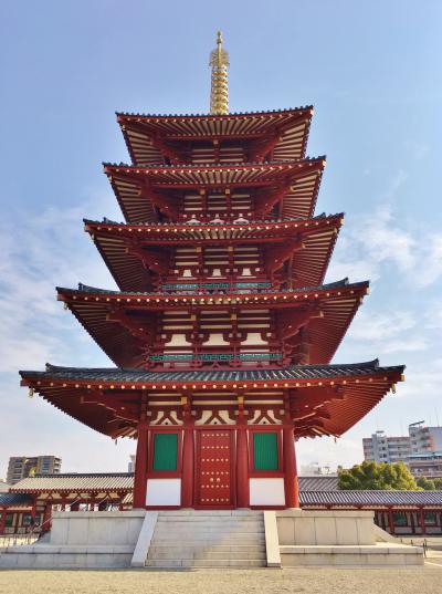 四天王寺のシンボル的な存在で、回廊に囲まれた中心伽藍の南側に建っています。593年に創建されて以来、7度も焼失しています。現在の建物は8度目に再建され、高さ39.2m、鉄骨鉄筋コンクリート製で屋根は本瓦葺となっています。高さがあるので周囲からでも容易に眺めることができます。普段は中に入り塔に上ることもできるようですが、新型コロナの影響か扉は閉ざされていて中の様子を伺うことができませんでした。
