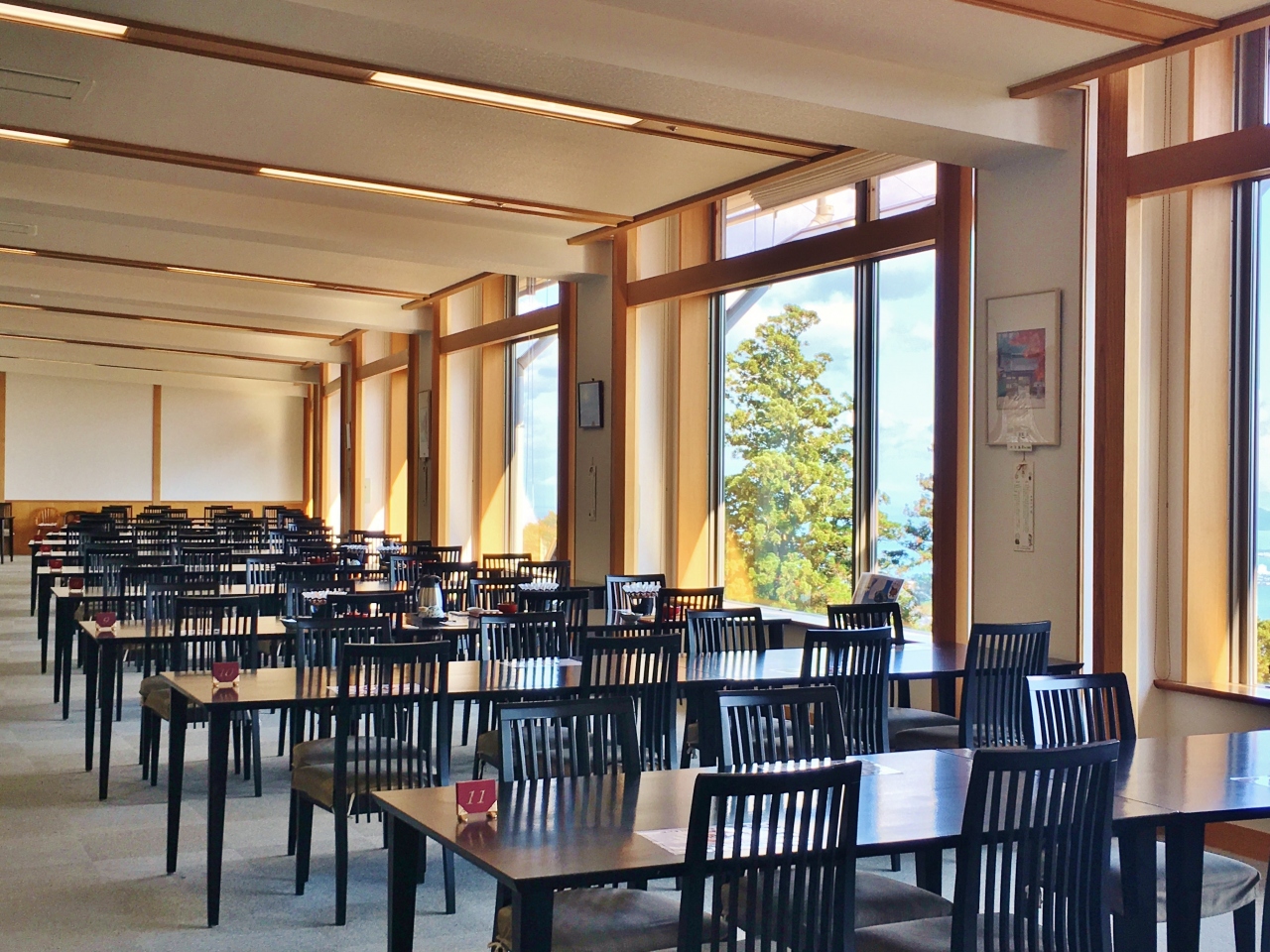延暦寺会館の2階にあります。窓際の席からは比叡山の森林と琵琶湖が眼下に見渡せ、景色を楽しみながら食事ができます。紅葉の時期だったので、木々が赤く染まって美しかったです。HPでは事前予約制と書かれてあり電話して確かめました。当日なら数量限定で精進料理の比叡御膳のみとのことでした。開店時間に合わせて行くとまだ混雑もなく、ゆっくりと食事をすることができました。あっさりとした胃に優しい味付けで、小鉢やお鍋などボリュームはまずまずあり、佃煮とごま豆腐が美味しくて印象に残りました。食後は1階に下り、喫茶でまた景色を眺めながらカフェもいただけて良かったです。