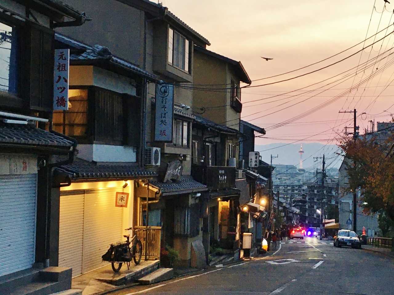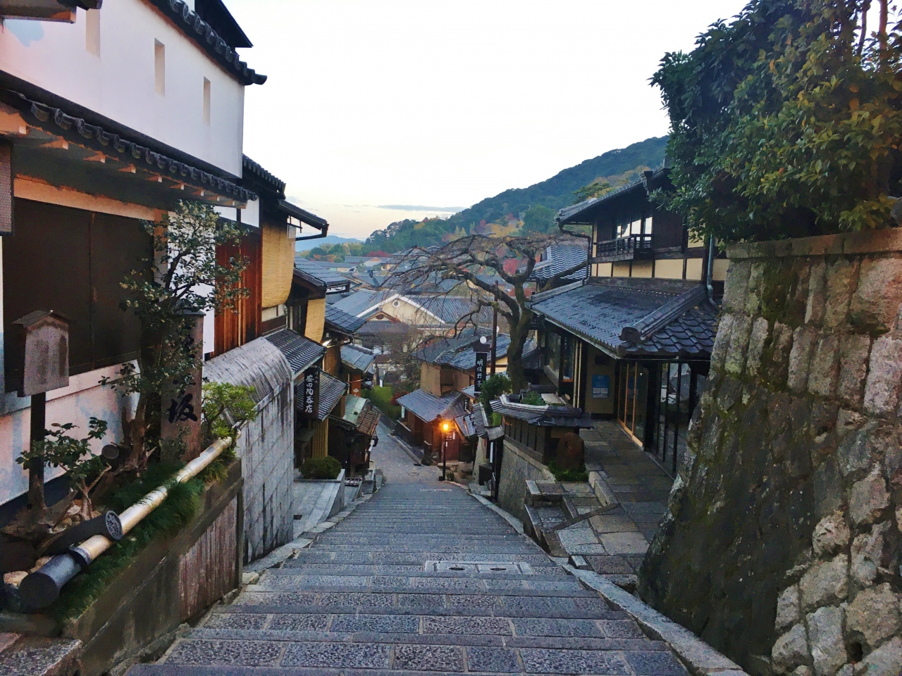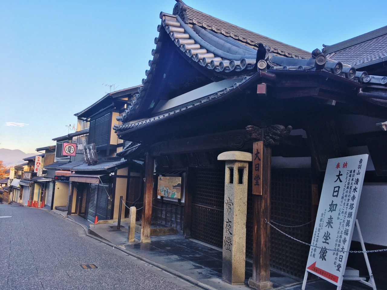 清水寺、高台寺や八坂神社など由緒ある寺社仏閣の参道に沿って、三年坂や二年坂には、江戸末期から大正時代に建てられた町家のお土産店や茶店などが立ち並び、石畳の坂道と合わさって風情がある光景が広がります。京都屈指の観光地で多くの人で賑わう日中を避け、朝早く周辺を散歩しました。まだ人もおらず辺りは静まり返っていて当時の面影を感じることができました。