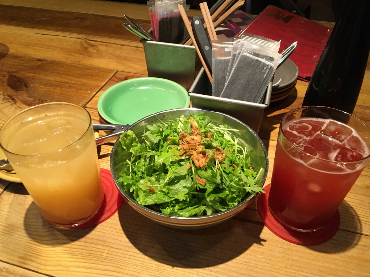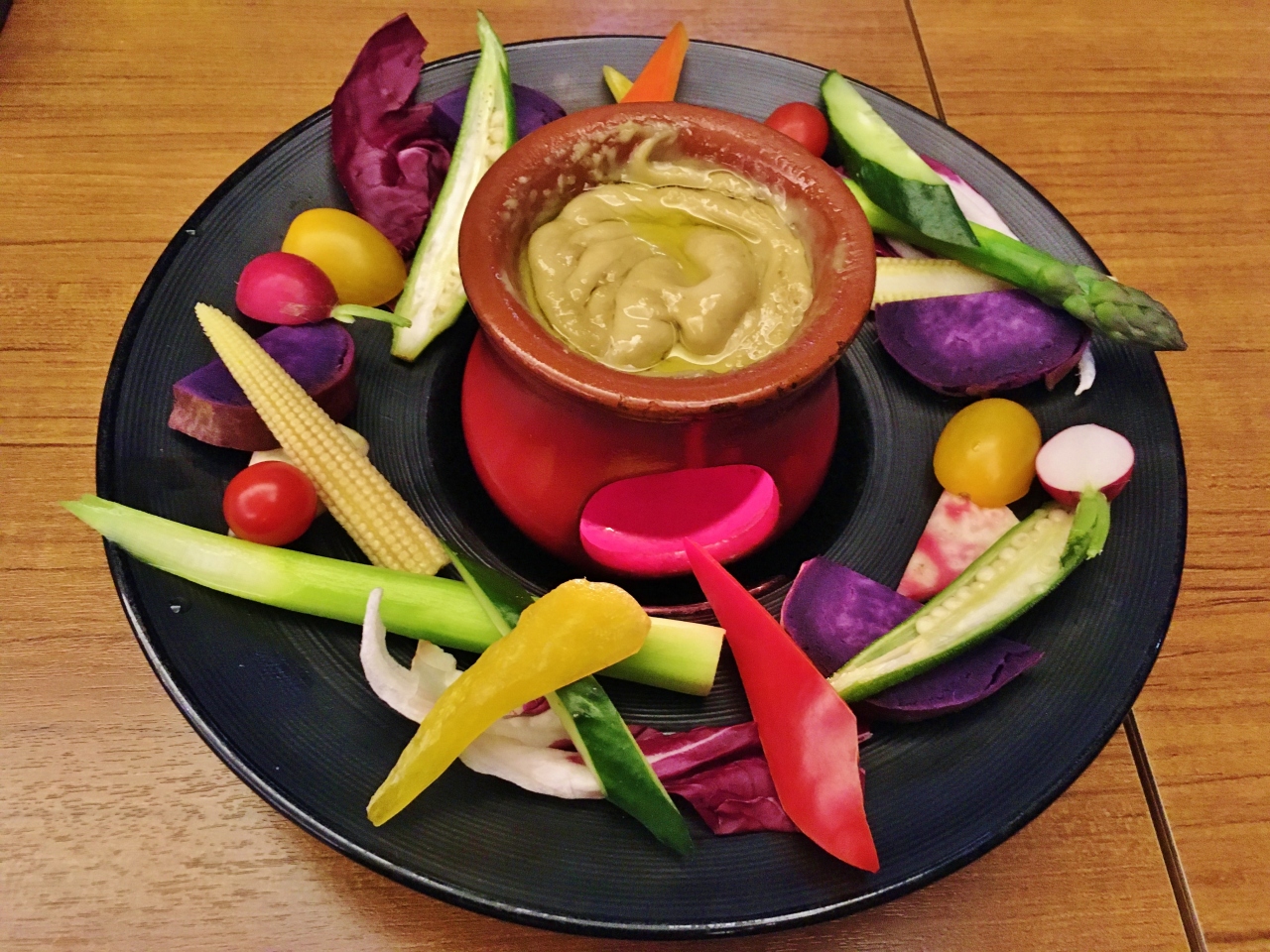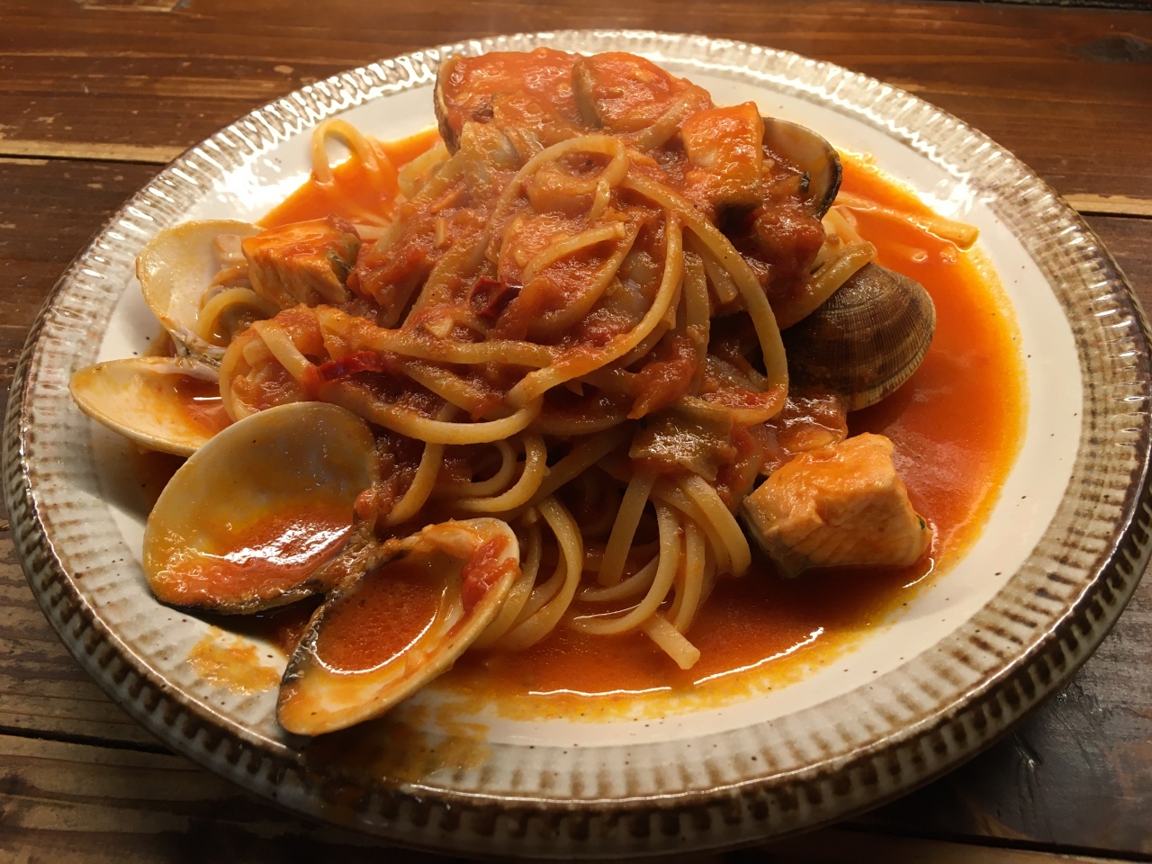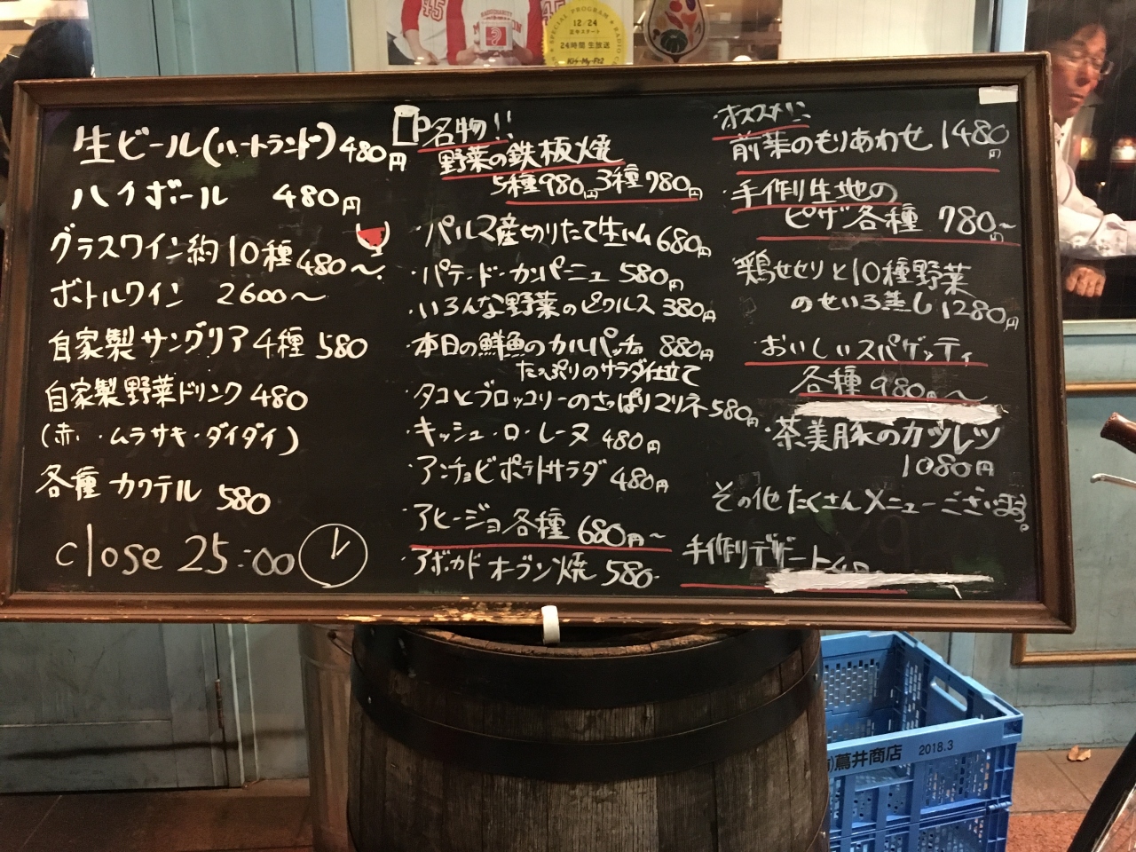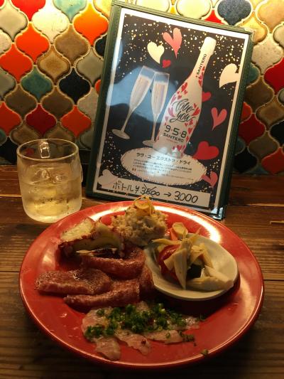 国道2号線沿い、水色のオシャレな外観が特徴的なお店です。ガラス張りの薄暗い店内に入ると人がぎっしり、とても賑わっていましたが、オープンキッチン前にあるカウンター席に案内されたので、さほど気になりませんでした。前菜盛り合わせ5種は大皿に鮮魚のカルパッチョ、タコのマリネ、ローストビーフ、ポテトサラダ、ピクルス盛り合わせと豊富でアルコールも進みます。他に生ハム、魚介のペスカトーレ、野菜の鉄板焼き等を注文。野菜は種類も色々と選べ、焼いてあるので香ばしく美味しかったです。