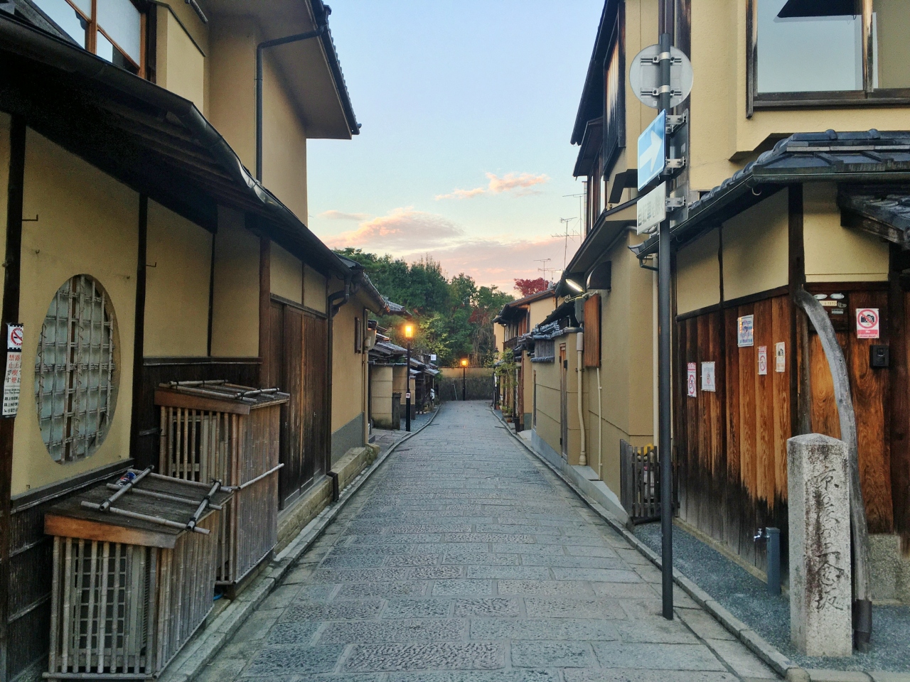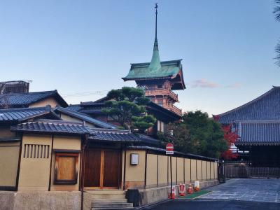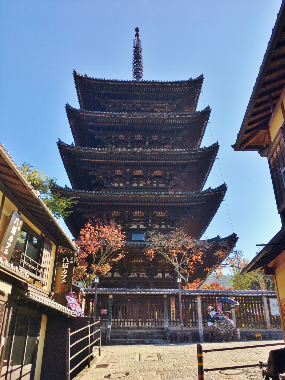 清水寺方面から祇園へ向かう途中に通りました。立派な五重塔である八坂の塔は、一般拝観はありませんが京都の顔として広く知られています。周辺には、京都の町家や人力車とこれぞ京都という風景が広がっていて、記念写真スポットとして有名で観光客だけでなく撮影でも多く使われています。少し距離を置いた方が周囲の町の風景も入り、全体が綺麗に写ります。