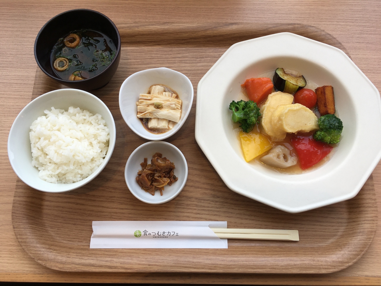 阪神電車の西宮駅に直結した商業施設“エビスタ西宮”の3階にあります。梅の花の系列店で豆腐、湯葉、豆乳を使った料理やスイーツを扱ったヘルシーなカフェレストランです。11時オープンにお店に入ると、1席のみの窓に面したカウンター席に案内されました。店内はナチュラルな色使いでゆったり居心地良い雰囲気です。健康バランス定食「ふわふわ湯葉巻き真丈と野菜のみぞれ煮定食」を注文しました。付け合わせにがんもどき、湯葉佃煮、金芽米ご飯、赤出汁がついています。湯葉巻き真丈は外はサクッと中はフワッとしていて、湯葉も梅の花のお味でで美味しかったですが、全体的に量が少なくかなり小食な方向けだと思いました。