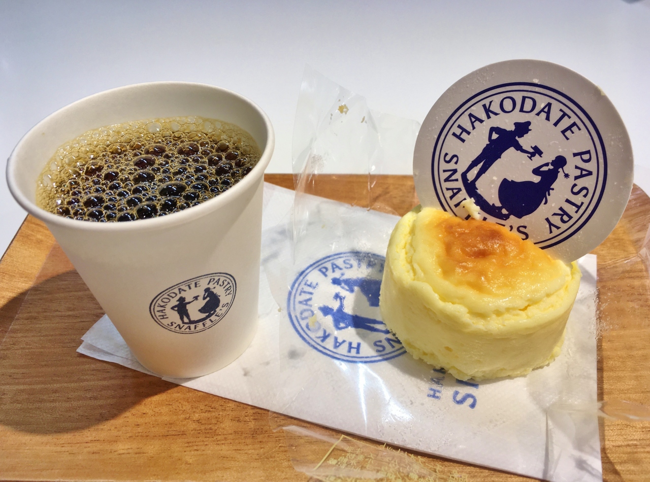 ベイエリアの金森赤レンガ倉庫にあります。店舗に併設されているカフェへ行こうとすると、手前のカウンターバーでチーズオムレットとコーヒー付のセットがあり、そちらで頂くことにしました。チーズオムレットは種類が色々あり、選ぶことができます。初めてだったのでお試しにもちょうど良く、割引券をもらえたので後でお土産用にいくつか購入しました。