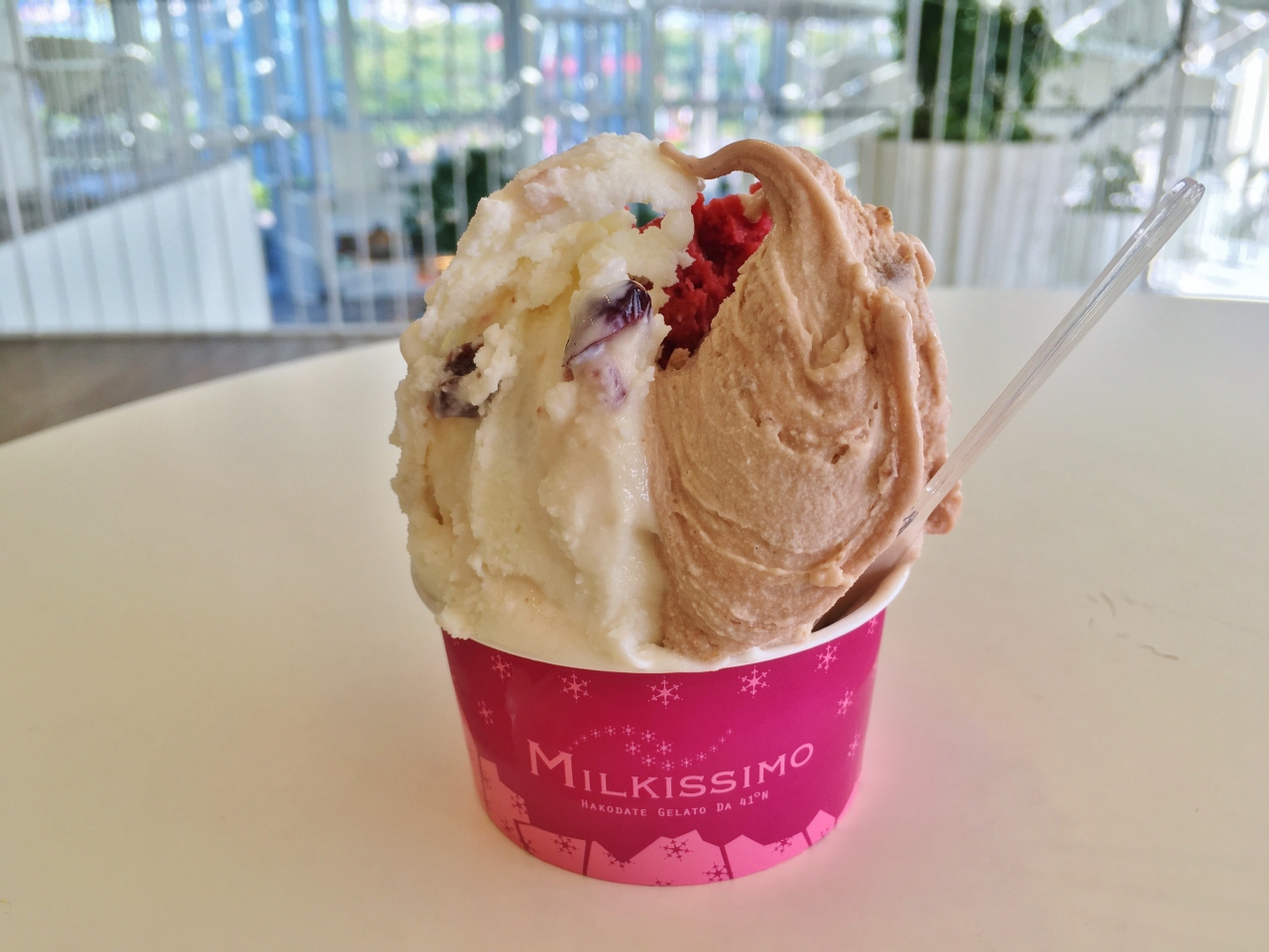 五稜郭タワーで景色を楽しんだ後、下りエレベーターへ乗って2階に到着すると目の前にあります。ガラス張りで広く明るい空間にテーブルと椅子も置かれていて、注文後はそちらで頂くことができます。他には函館金森赤レンガ倉庫にも店舗がありました。色々と試したくてラムフレッタクレマ、ハスカップノルド、期間限定のマロンティラミスの3フレーバーを注文しました。北海道ならではのフレーバーも豊富に揃っていて、フルーツの味が濃厚で美味しかったです。