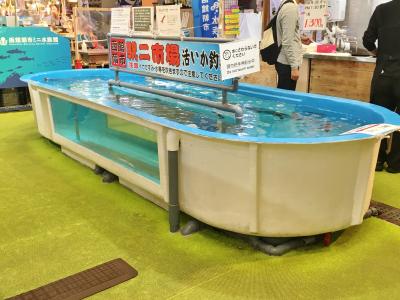 JR函館駅からすぐ、駅ニ市場内にあります。市場の中央にある釣り堀式の生け簀の中で泳ぐイカを釣り、釣ったイカはその場で調理されてそのまま頂くことが出来る、という体験コーナーです。並ぶ人も多くいて、朝市の中でひときわ目立っていました。動いている物を食べるのは苦手なので、近くで見ているだけでしたが、皆さん楽しんでおられるようでした。