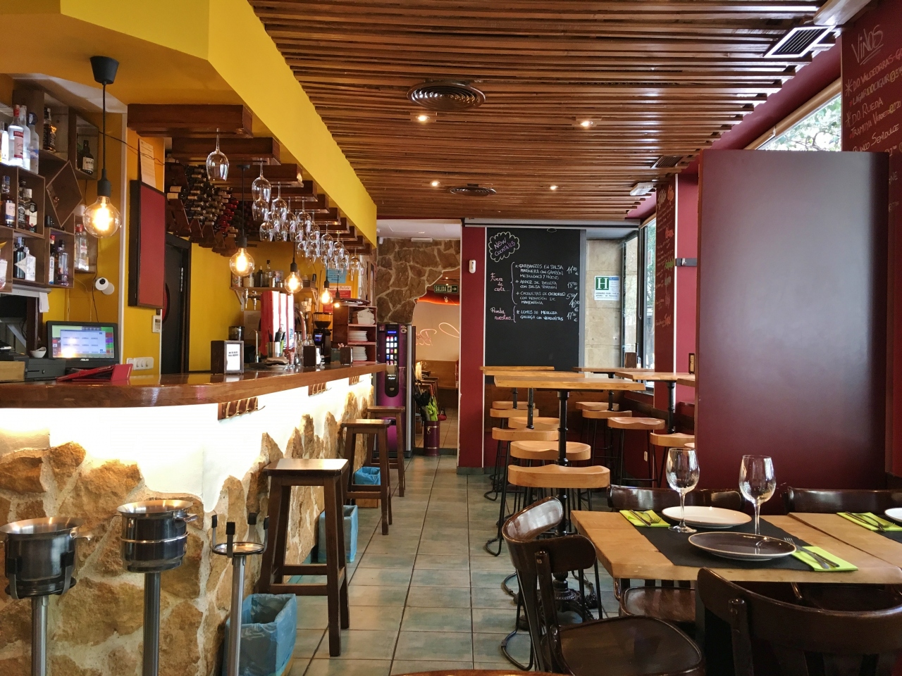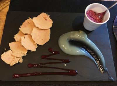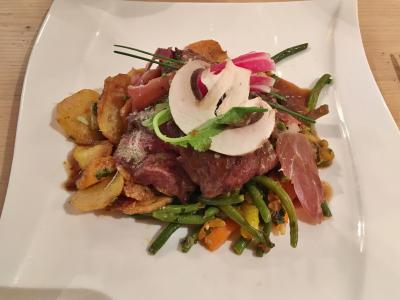宿泊した初日に行くと満席の看板が出ていたので、翌日のディナーにオープン時間に訪れました。木の温もりを感じる明るくて開放的な雰囲気の店内です。フォアグラのテリーヌ、牛フィレ肉のセラーノハムと野菜添え、デザートにプロフィットロールを注文しました。お肉はとても柔らかく野菜はハムもたっぷり入り、ボリューム満点の一皿でした。最後はお腹いっぱいになりながら、他のお料理も全部美味しくいただきました。人気店の様で、この日も開店から暫くたつと満席の看板が置かれていました。お値段もそれ程高くなく店員さんもフレンドリーで、再び訪れて良かったと思いました。