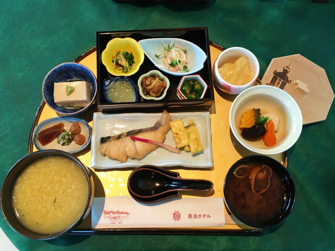 奈良ホテルに宿泊した時、ディナーと朝食で利用しました。耐震工事で暫くの間クローズし、春に営業再開されたそうです。高い天井とシャンデリア、深いグリーンのテーブルクロスが優雅で、落ち着いた雰囲気の内装でした。お料理は前菜、スープ、国産牛フィレ肉のメインとデザートのコースでした。量は多くありませんが、どれも丁寧に作られて美味しかったです。席からは、五重塔がうっすら浮かび上がって見え、幻想的な光景でした。朝食は茶粥定食を頂きました。湯葉や胡麻豆腐、鰆、炊き合せの他、彩豊かな小鉢が並び、見た目も華やかでこちらも大変美味しかったです。