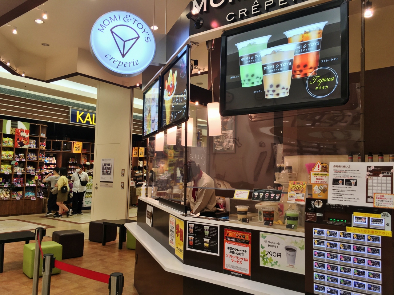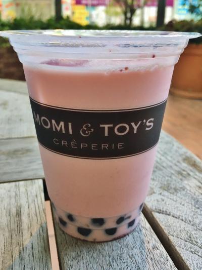JR尼崎駅にあるQズモール内のフードコートの一角、カルディーの向かいにあるクレープ店です。先に券売機で購入してから注文するシステムで、今回は中にタピオカが入ったイチゴミルクを注文しました。他にもミルクティーベースやソーダベースなどドリンクメニューも種類豊富に揃っていました。お店前に椅子がいくつか用意されているので座っていただくことができます。