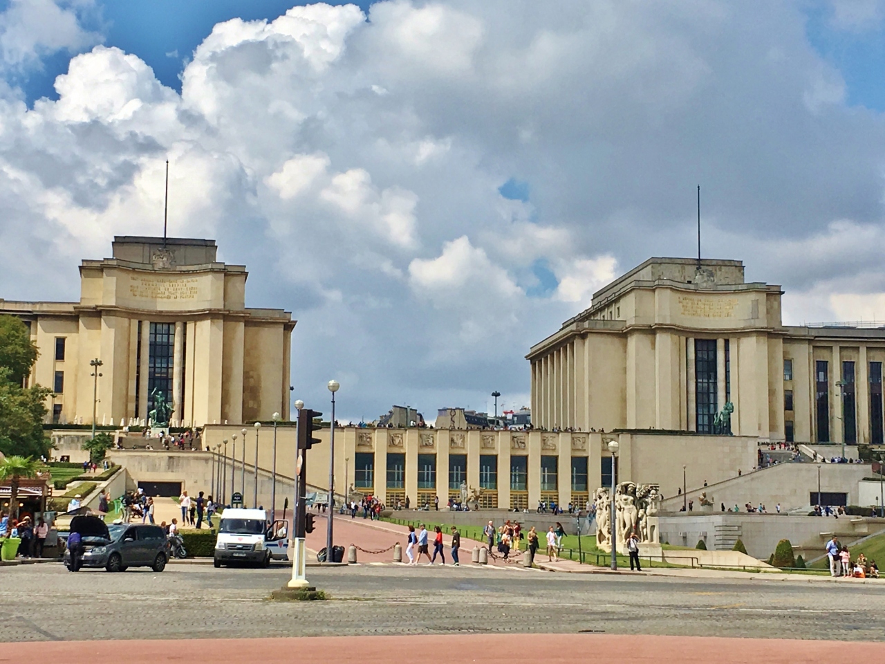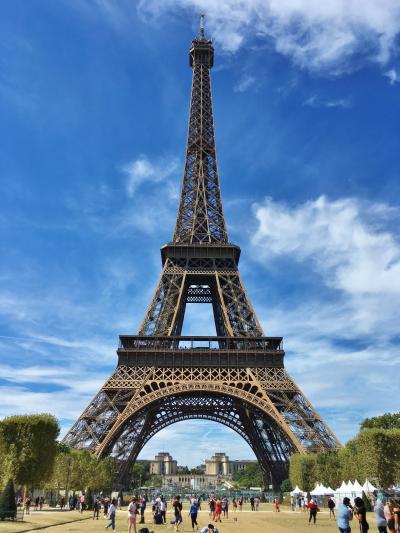 エッフェル塔ふもとにある公園で、ここから見上げるエッフェル塔はとても迫力があります。公園では散策したりピクニックを楽しんだり、皆さんのんびり過ごしています。シャイヨー宮からエッフェル塔を眺め、トロカデロ庭園を通って公園へ歩いていきました。芝生が綺麗で、パリの中心部と思えない緑が広がっていてちょうど良いお散歩になりました。