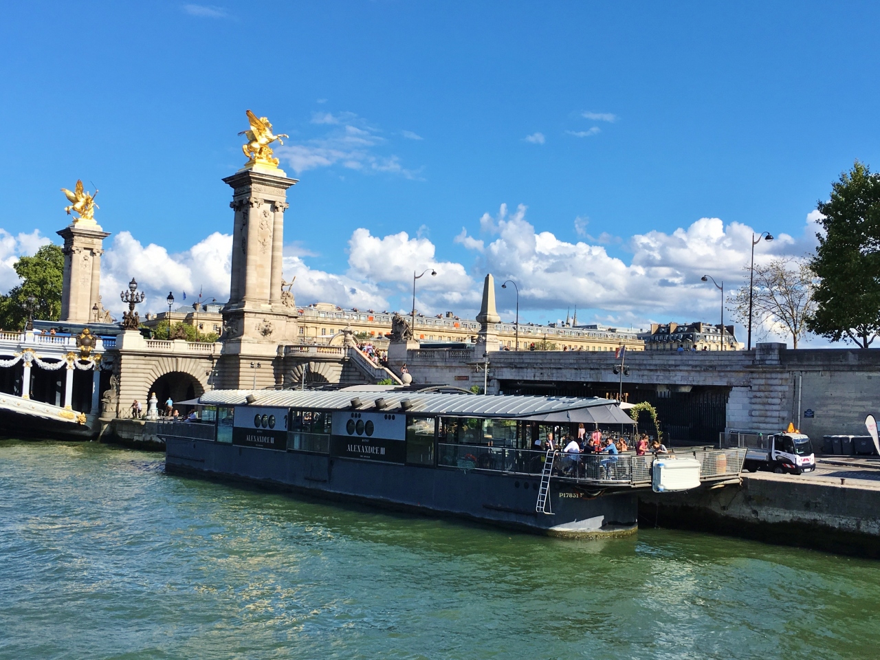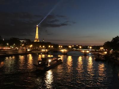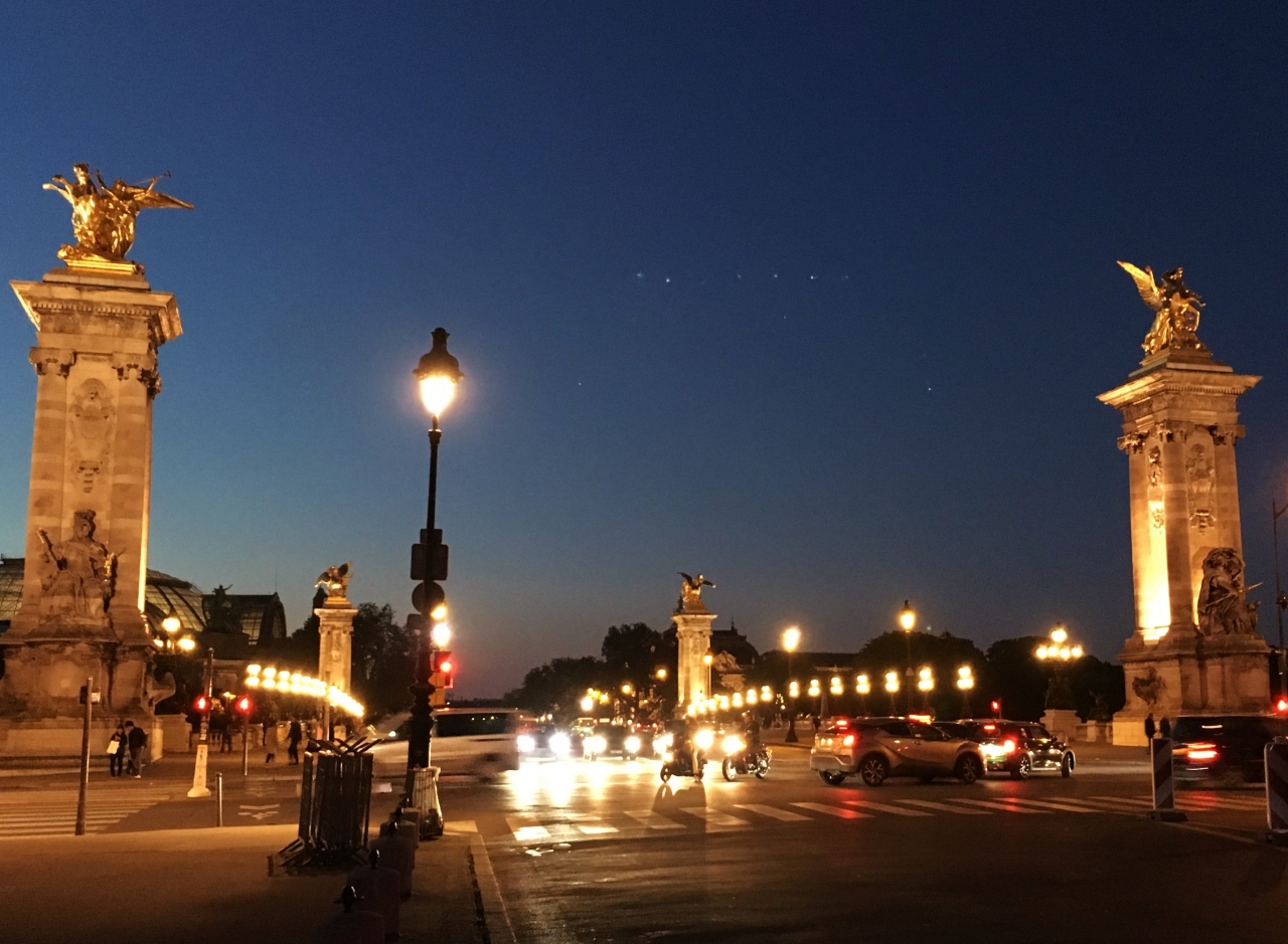 1900年のパリ万国博覧会にあわせ、フランスとロシアの友好の証としてロシア皇帝より寄贈されたもので、黄金の女神像と彫刻が他の橋と比べ、際立って豪華絢爛な造りです。クルーズ船から見ても黄金が輝いて美しかったです。エッフェル塔も綺麗に見えるので、シャンパンフラッシュを橋の上から眺めました。