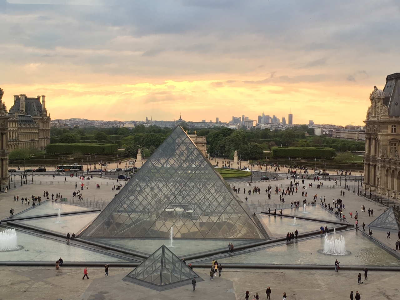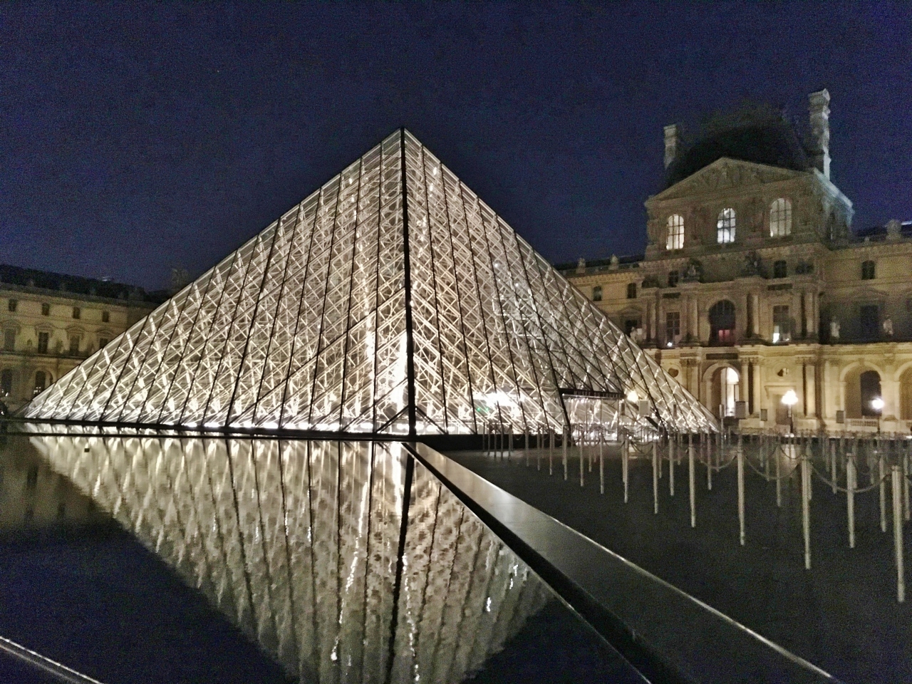 ルーブル美術館の入口にもなっています。いつも入場待ちの行列ができているので、美術館へは地下の入り口から入場しましたが、ピラミッドのある中庭を見るため、鑑賞前後に訪れました。夜は水面に逆さピラミッドが輝いて見え、とても美しいです。人も少なく、日中の賑わいと異なった静寂な雰囲気に包まれています。