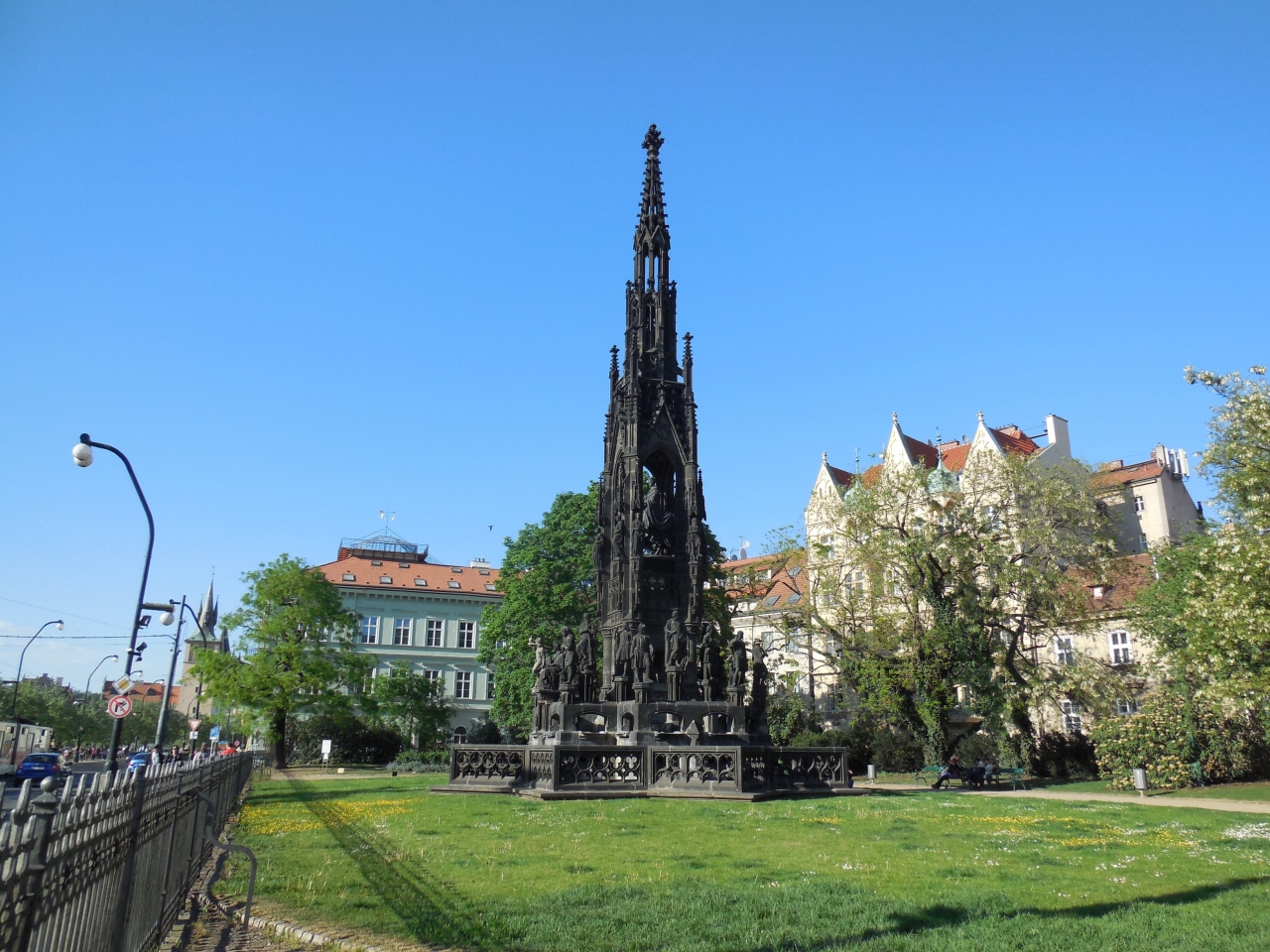 カレル橋からチェコ軍団橋(レギー橋)へ、ヴルタヴァ川沿いを歩いている時に通りかかった、小さな公園の中央にあったモニュメントです。噴水とは気づきませんでした。比較的大きく、離れたところからでも見えます。黒ずんでいましたが、細かい彫刻が施されていて存在感もあり、目立っていました。