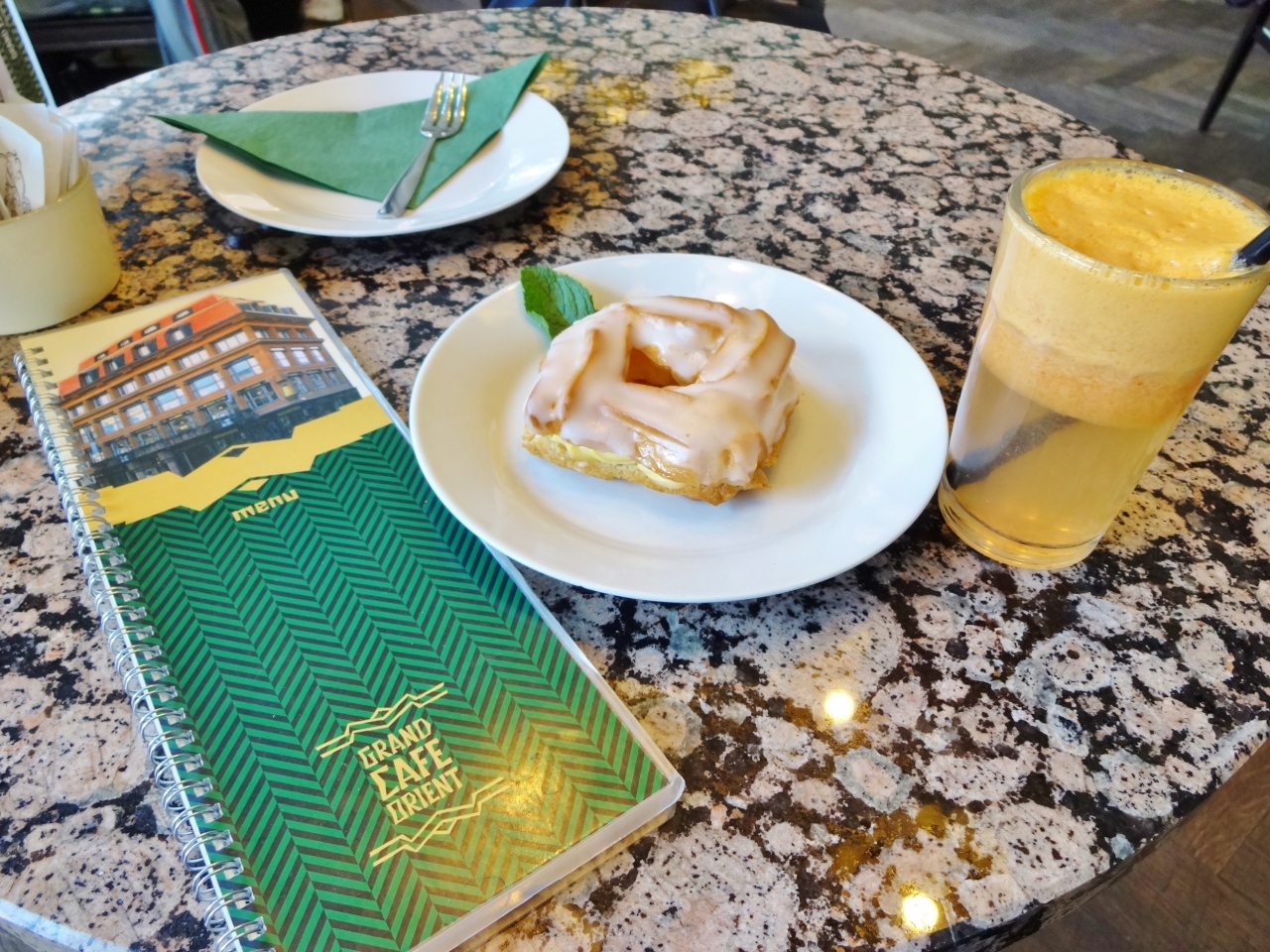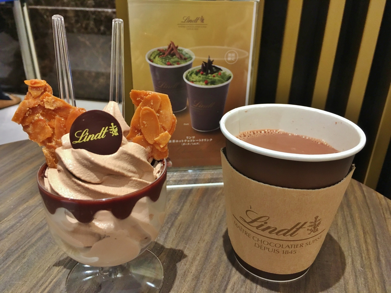 京都へ食事をしに行った後、四条通りを歩いていてふと見るとリンツがありました。リンツは海外に行った時によく購入するチョコレートメーカーです。カフェが併設されていたので、食後のデザートをここでいただくことにしました。冷たいのと温かいのとまぜこぜで、ホットチョコレートとミルクのソフトクリームショコラを注文。ホットチョコレートはこれといって覚えている印象があまりなく、、ソフトクリームは濃厚な味で、トップにのったアーモンドヌガティーヌがカリカリ食感で美味しかったです。