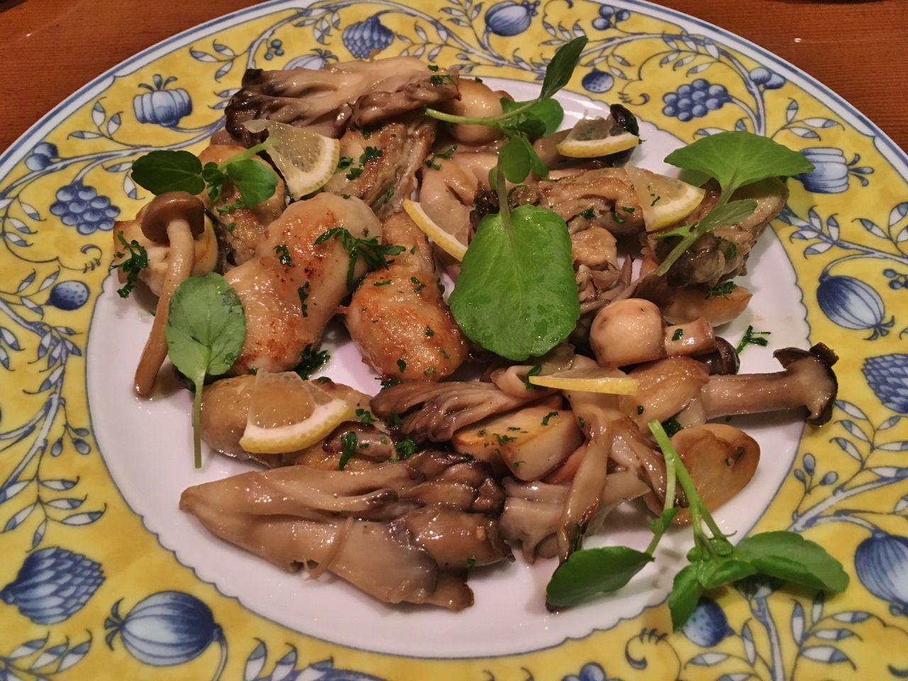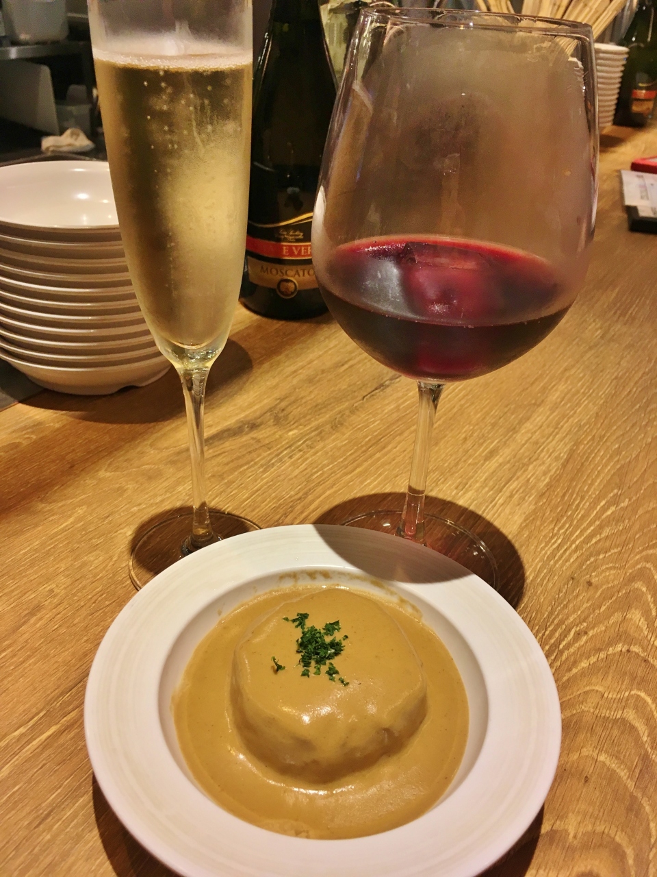 夕ご飯には早い時間にお店を覗いてみると、待っている人は数組程度。いつもすごい行列を見ていたのでので少し待つと意外と早く案内されました。お店は賑わっていて席の間隔も狭いのですが、カウンター席の端だったのであまり気にならずにすみました。注文したのは大根のポルチーニ茸クリームソース掛け、フレッシュトマトパスタ、牛ほほ肉の赤ワイン煮込み、タコとイカ下足のソテー、フレンチお好み焼き「サヴォア」です。飲物はグラスでワインやシャンパンを何杯かいただきました。お値段はリーズナブルで凝ったメニューもあり、色々楽しめます。店内もオシャレな雰囲気で人気の理由がわかります。系列店も利用したことありますが、そちらも人気でした。久しぶりにまた行きたくなりました。