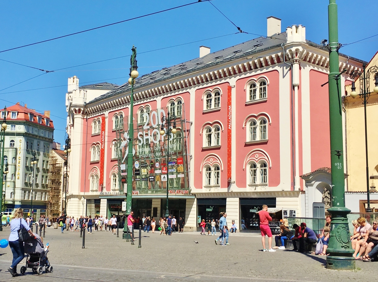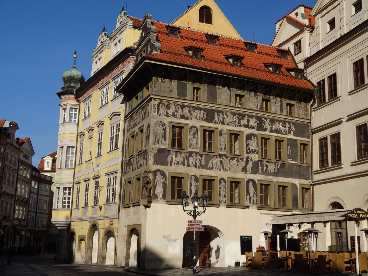 「一分の家」は天文時計から左へ5件目、黒い壁の建物です。壁面はスグラフィット(漆喰)装飾が施され、周囲の建物様式と全く違うため目立っています。また、作家のフランツ·カフカが、6~12才頃(1889年~1896年)まで7年間住んでいた家として有名です。