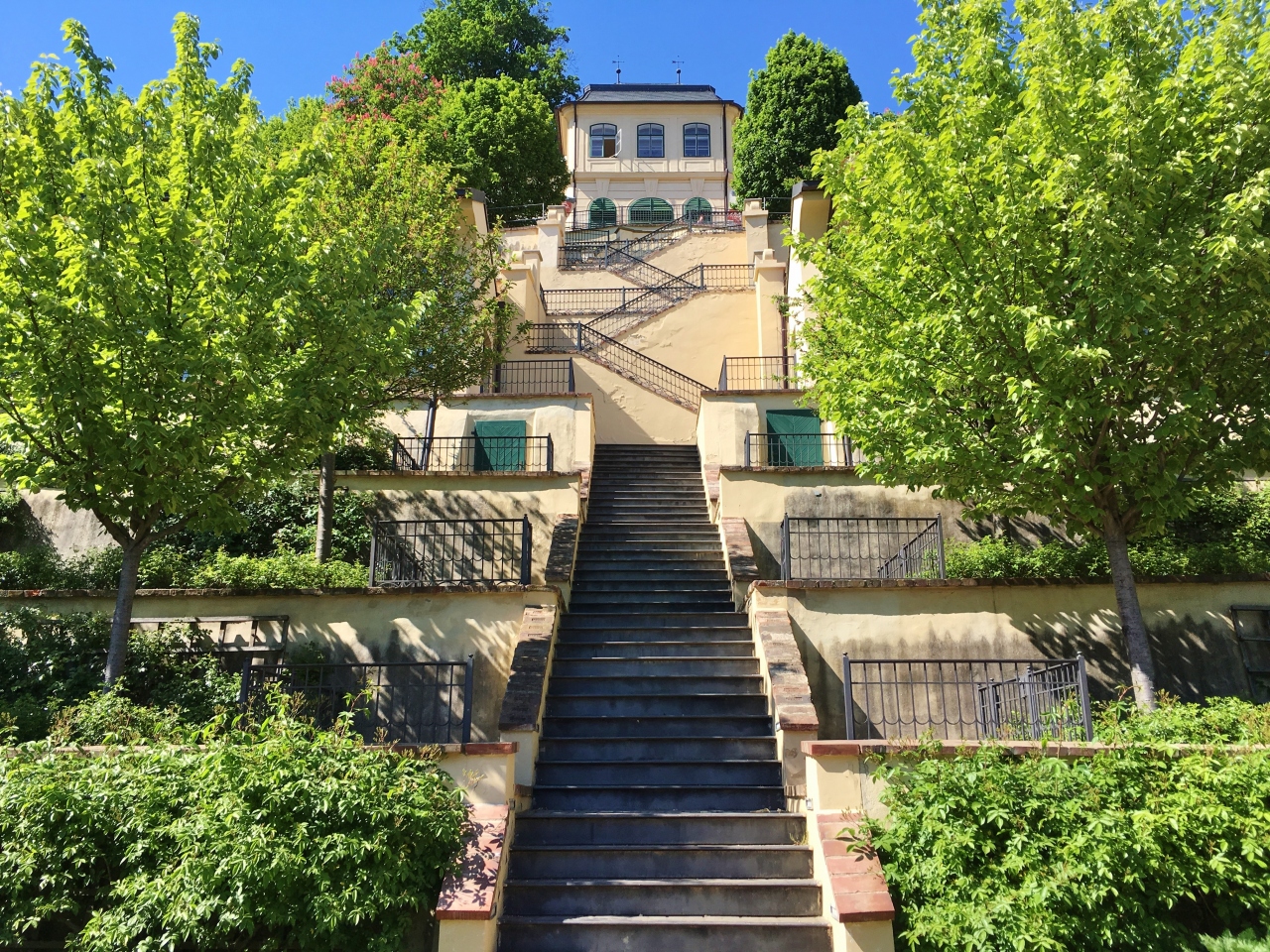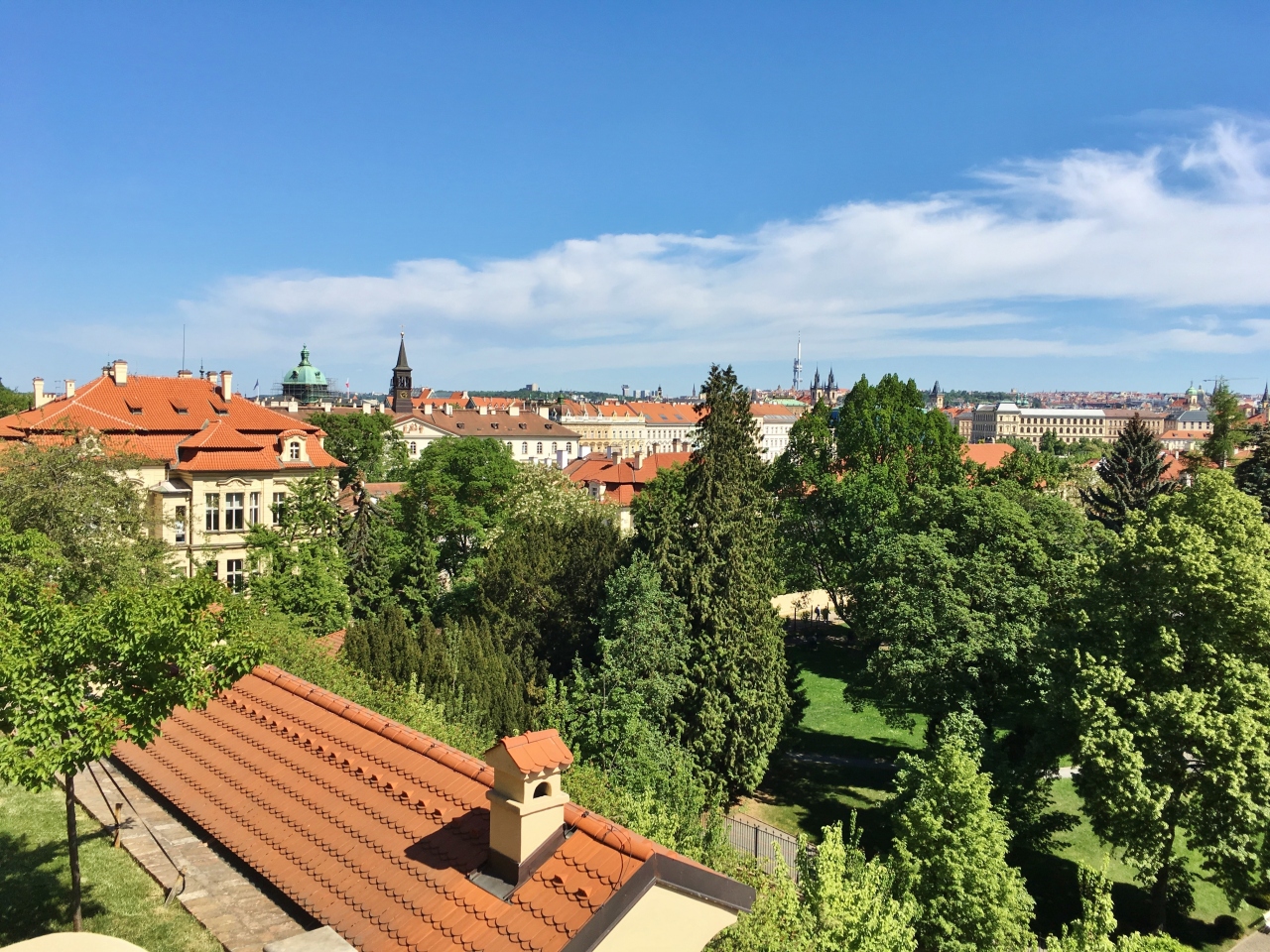 Malostranská駅を降り、ヴァルトシュテイン庭園外側をぐるっと周り、門を入ると受付があります。事前にGooglemapで場所と入口を確認しました。プラハ城の南にある見晴し台からも入れます。庭園は中央が階段状になっているのが特徴で、蛇行しながら登っていきます。バラ園などもあるようですが、GWの時期はまだ早くお花は咲いていませんでした。坂道を上りきるとプラハの街並みが一望できる展望スペースに着きます。ベンチもあるので、休憩しながら景色を眺めていました。有料なこともあってか訪れる人も殆どなく、ほぼ独占状態でした。