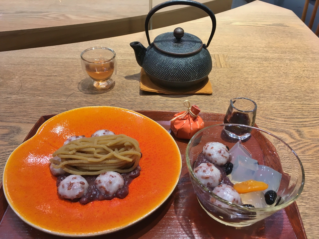 阪急梅田本店の1F、和菓子のたねや併設のお茶屋さんです。一番奥まった所にありますが、並んでいて入れず素通りすることも多いです。店内はカウンター席もあり、1人で来ている人も見かけました。あんみつと季節のからみ餅、栗小豆を注文。お餅はお正月限定の赤米入りです。優しいお味の小豆茶をいただきながら、ホッと一息つけました。